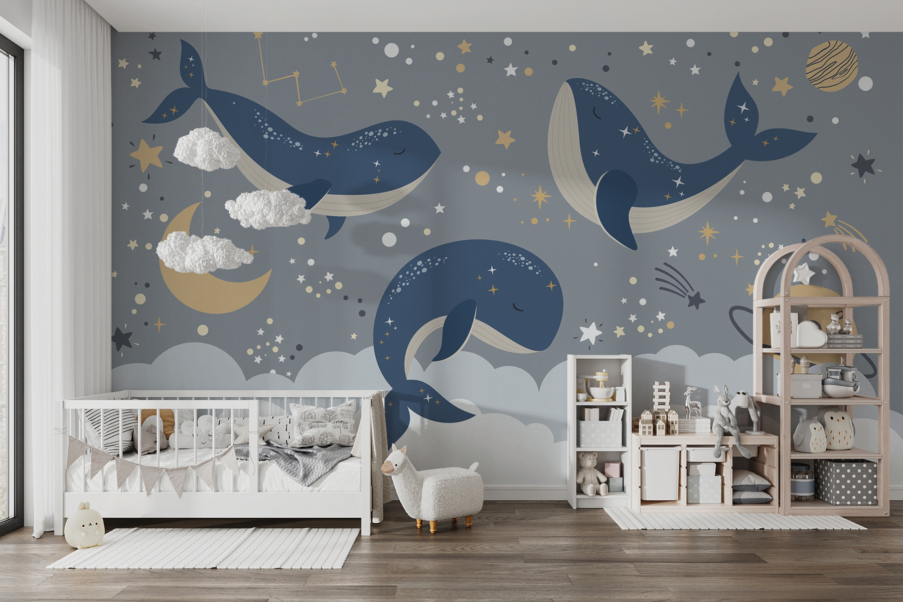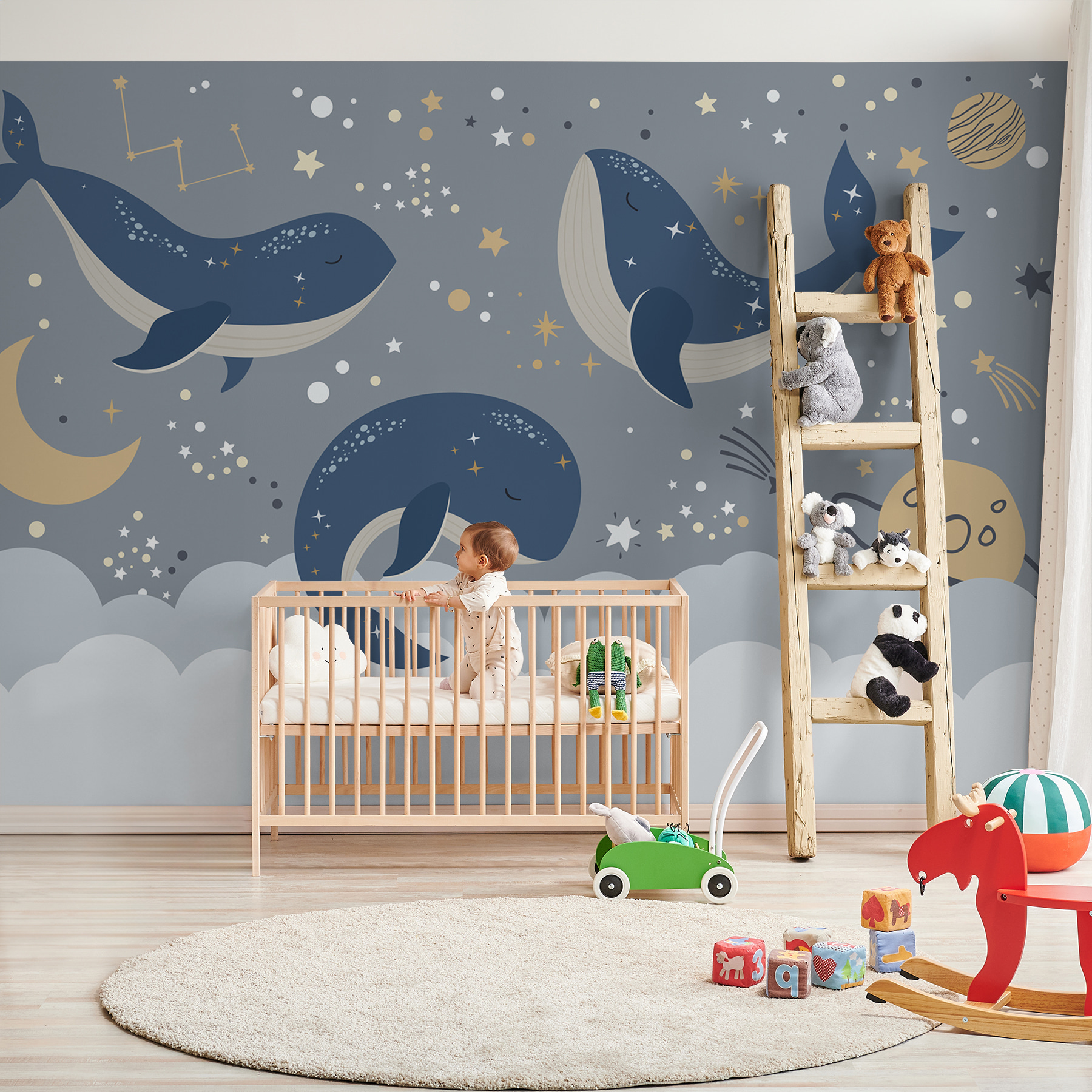 Chcesz dodać odrobinę cudowności do pokoju swojego dziecka? Sprawdź tę marzycielską fototapetę “Niebieski wieloryb z białym ogonem i gwiazdami!”. Wyobraź to sobie na ścianie swojego dziecka – to jak jego własny kawałek nocnego nieba, wraz z przytulnymi niebieskimi wielorybami delikatnie unoszącymi się w morzu gwiazd i konstelacji. Idealny do pokoju dziecięcego lub przestrzeni każdego małego poszukiwacza przygód, dodaje odpowiedni dotyk magii i spokoju. Ponadto te śpiące wieloryby wydają się obiecywać słodkie sny każdemu, kto pod nimi zasypia. Jest kapryśny, uspokajający i nieco zabawny – wspaniałe tło dla bajek na dobranoc i popołudniowych drzemek. Niezależnie od tego, czy chodzi o syna, córkę, czy o chwile przytulania się z dzieckiem, przekształca każdą ścianę w kojącą, rozgwieżdżoną przygodę.
