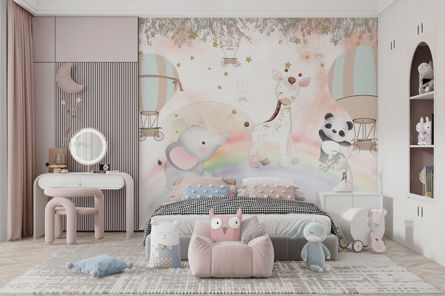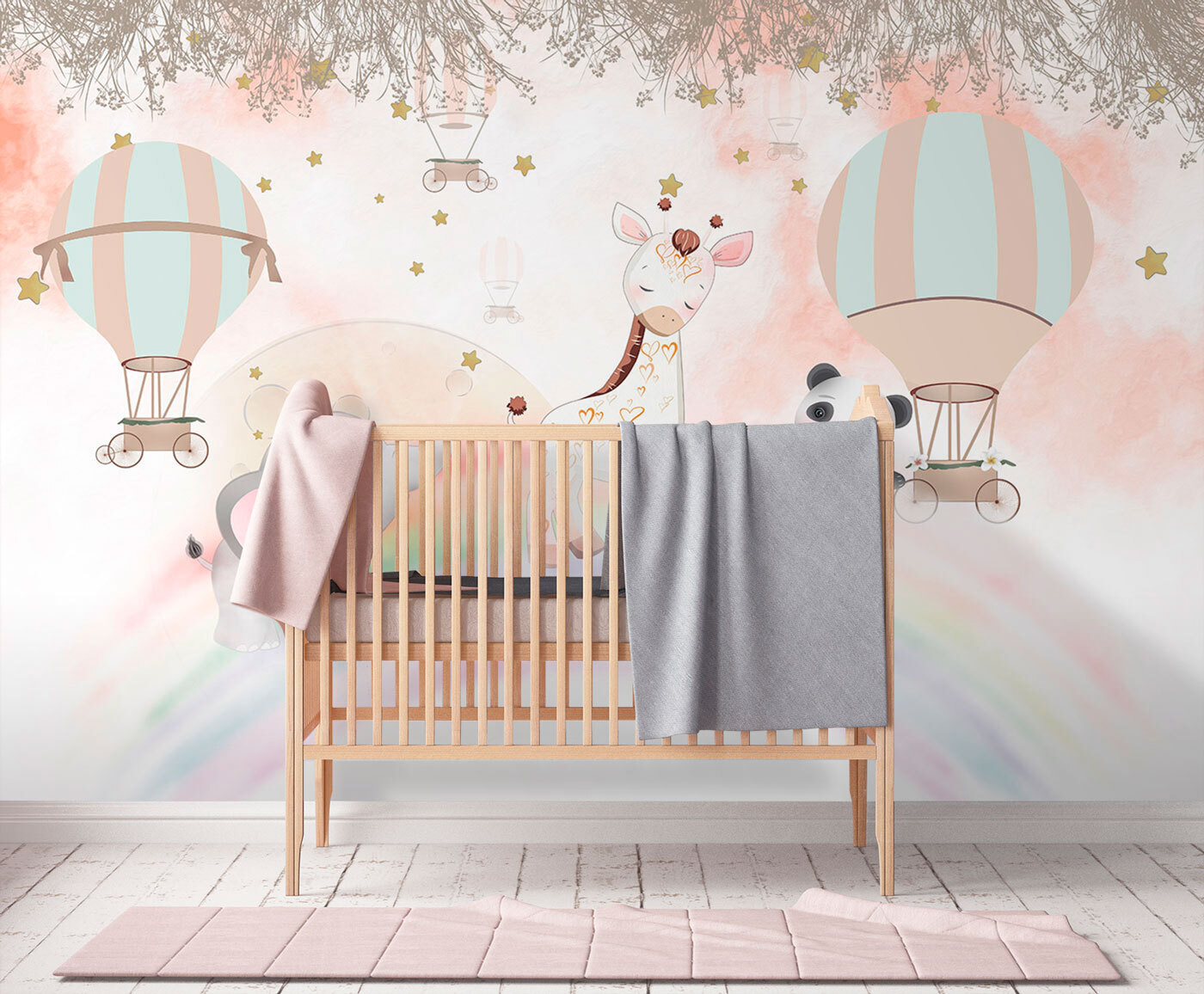 Rozjaśnij pokój każdego dziecka dzięki tej czarującej fototapecie z balonami na ogrzane powietrze! Wyobraź sobie senne niebo wypełnione kapryśnymi balonami unoszącymi się nad uroczymi zwierzętami, takimi jak urocza żyrafa, figlarna panda i słodki mały słoń. To scena, która zachęca do przygód i pobudza wyobraźnię. Wystarczy wyobrazić sobie maluchy wpatrujące się w nią, odpływające do krainy snów, marzące o szybowaniu wysoko ponad chmurami. Delikatne kolory tworzą przytulną atmosferę, idealną do przytulnych opowieści na dobranoc. Ta fototapeta to nie tylko dekoracja; to brama do świata fantazji. Kto nie chciałby dołączyć do tych balonowych przejażdżek? Przekształci każdą przestrzeń w zabawną przystań!