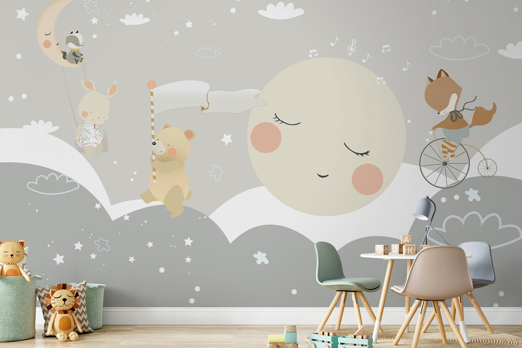 Zobacz tę uroczą fototapetę ścienną “Biała gwiazda na szarym tle”. To jak wejście do sennej bajki na dobranoc, idealnej do pokoju dziecięcego lub pokoju zabaw. Ta fototapeta ma kojące szare tło posypane migoczącymi gwiazdami, drzemiącym księżycem i uroczymi zwierzęcymi przyjaciółmi. Wyobraź sobie śpiącego niedźwiedzia i lisa jeżdżącego na fartuchu – totalne rozkosze dla małych odkrywców!