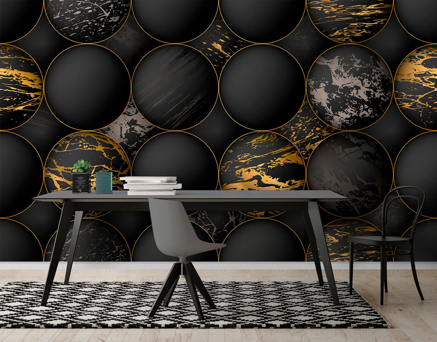 Przekształć zwykłą ścianę w przyciągające wzrok arcydzieło dzięki tej fototapecie z czarnymi kulami i efektownymi marmurkowymi wzorami. Wyobraź sobie: przytulny salon wypełniony śmiechem i goście podziwiający fajny wzór na ścianie. Fototapeta ma nowoczesny klimat, z nutką dramatycznej atmosfery, która może całkowicie zmienić nastrój. Być może oglądasz nowy serial, a twoje tło tylko podnosi estetykę gry. Te odważne kule tworzą poczucie głębi, dzięki czemu każde pomieszczenie wydaje się większe i bardziej żywe. Idealne dla tych, którzy chcą nadać swojej przestrzeni odrobinę osobowości i charakteru. Po co zadowalać się nudą, skoro ściany mogą opowiadać historię?