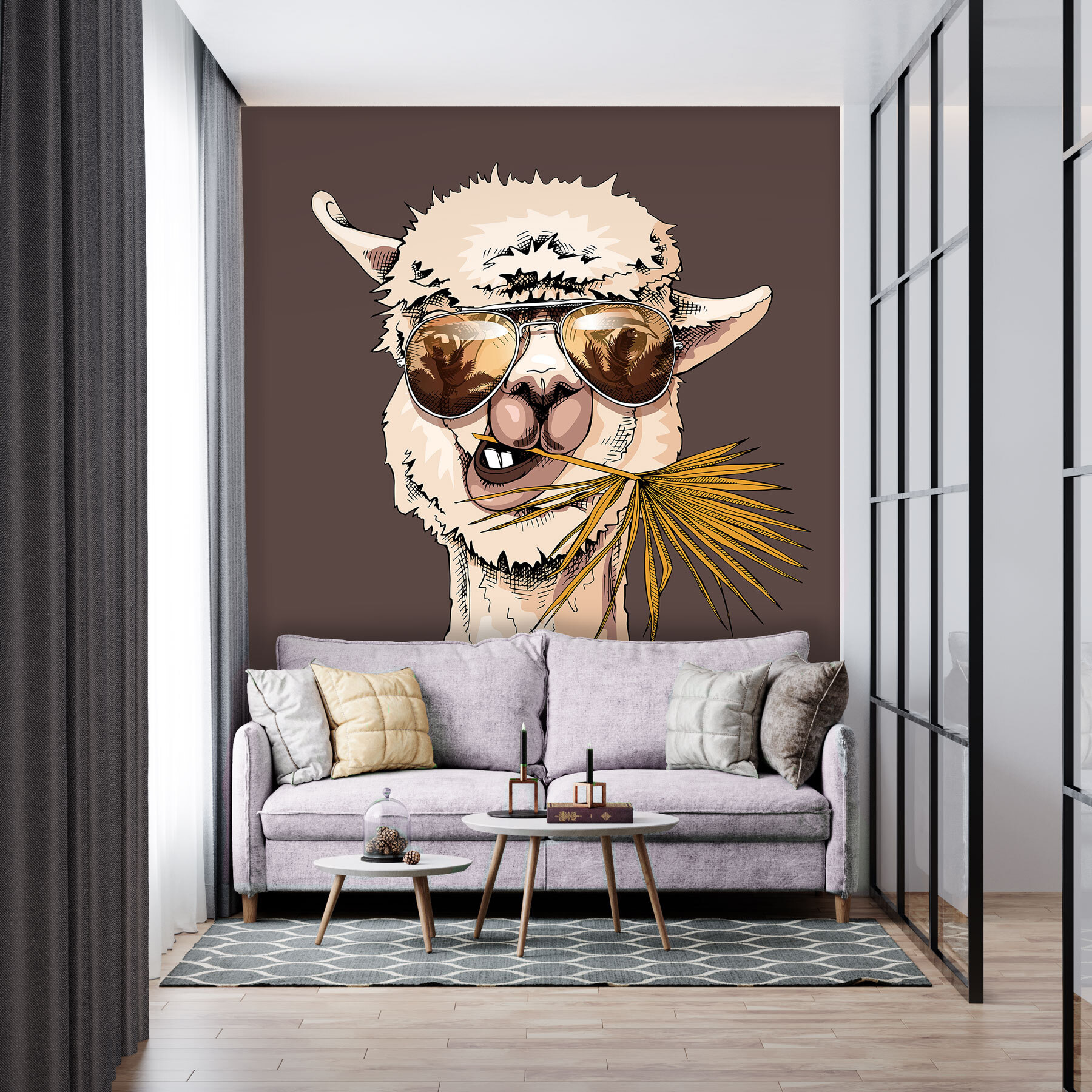 Czy kiedykolwiek przywitała się z tobą lama? Cóż, teraz masz szansę! Ta fototapeta ścienna przedstawia super stylową lamę kołyszącą się w cieniu – całkowicie wyluzowaną i gotową wnieść trochę zabawy do twojej przestrzeni. Wyobraź sobie tego gościa w pokoju dziecięcym lub na placu zabaw; doda mnóstwo charakteru i szczyptę kaprysu. Twoi goście będą się uśmiechać za każdym razem, gdy go zobaczą. Stonowane brązowe tło sprawia, że jest on nowoczesny i dobrze komponuje się z wieloma stylami wystroju. Niezależnie od tego, czy jest to fototapeta dla miłośnika zwierząt, czy po prostu dla kogoś, kto lubi unikalną sztukę ścienną, ta fototapeta z pewnością rozjaśni każde pomieszczenie!
