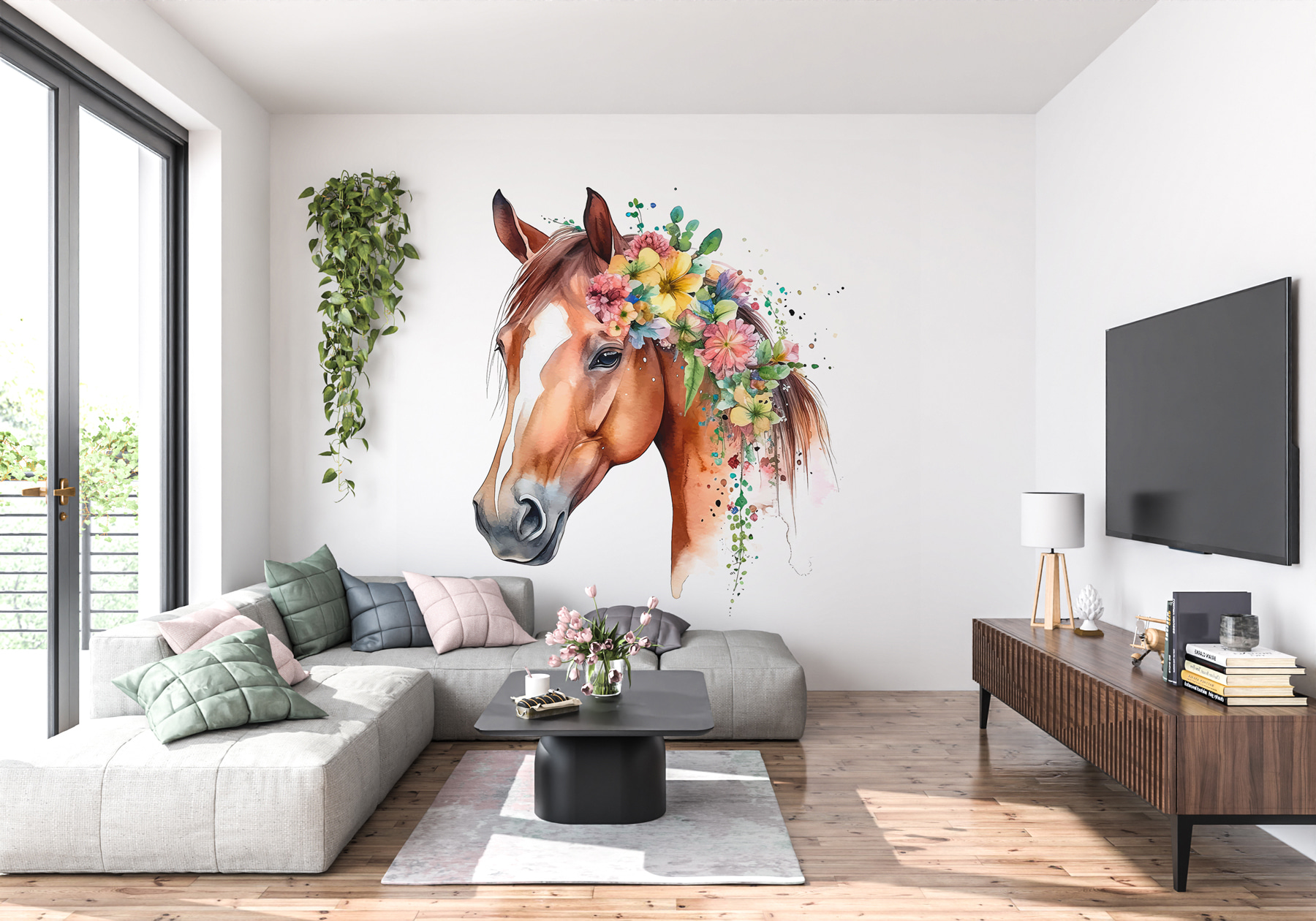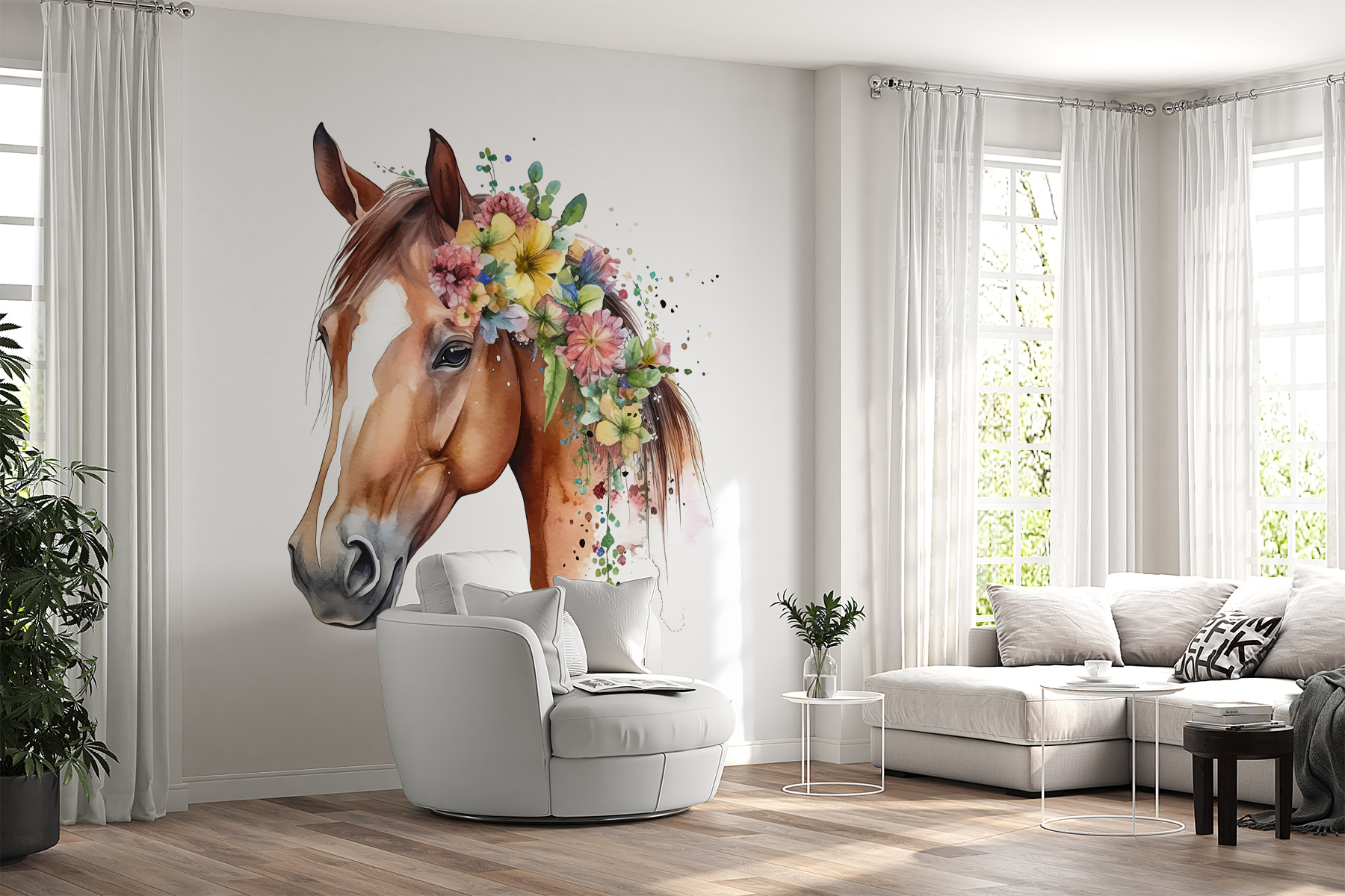 Wyobraź sobie, że wchodzisz do pokoju i witasz się z majestatycznym koniem przystrojonym w żywe kwiaty. Dokładnie to robi ta fototapeta – zamienia zwykłą ścianę w zachwycającą niespodziankę! Jest idealna dla miłośników zwierząt, dzieci lub każdego, kto chce dodać odrobinę kaprysu do swojej przestrzeni. Kolory są tak żywe, że praktycznie wyskakują ze ściany. Wyobraź sobie zachwyt swojego malucha lub uśmiech gości na widok tego oszałamiającego ogiera.