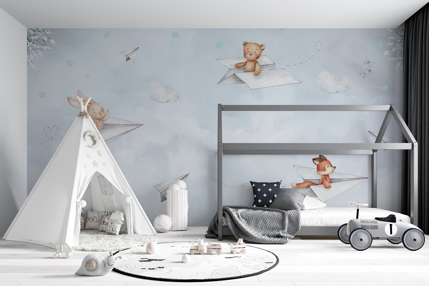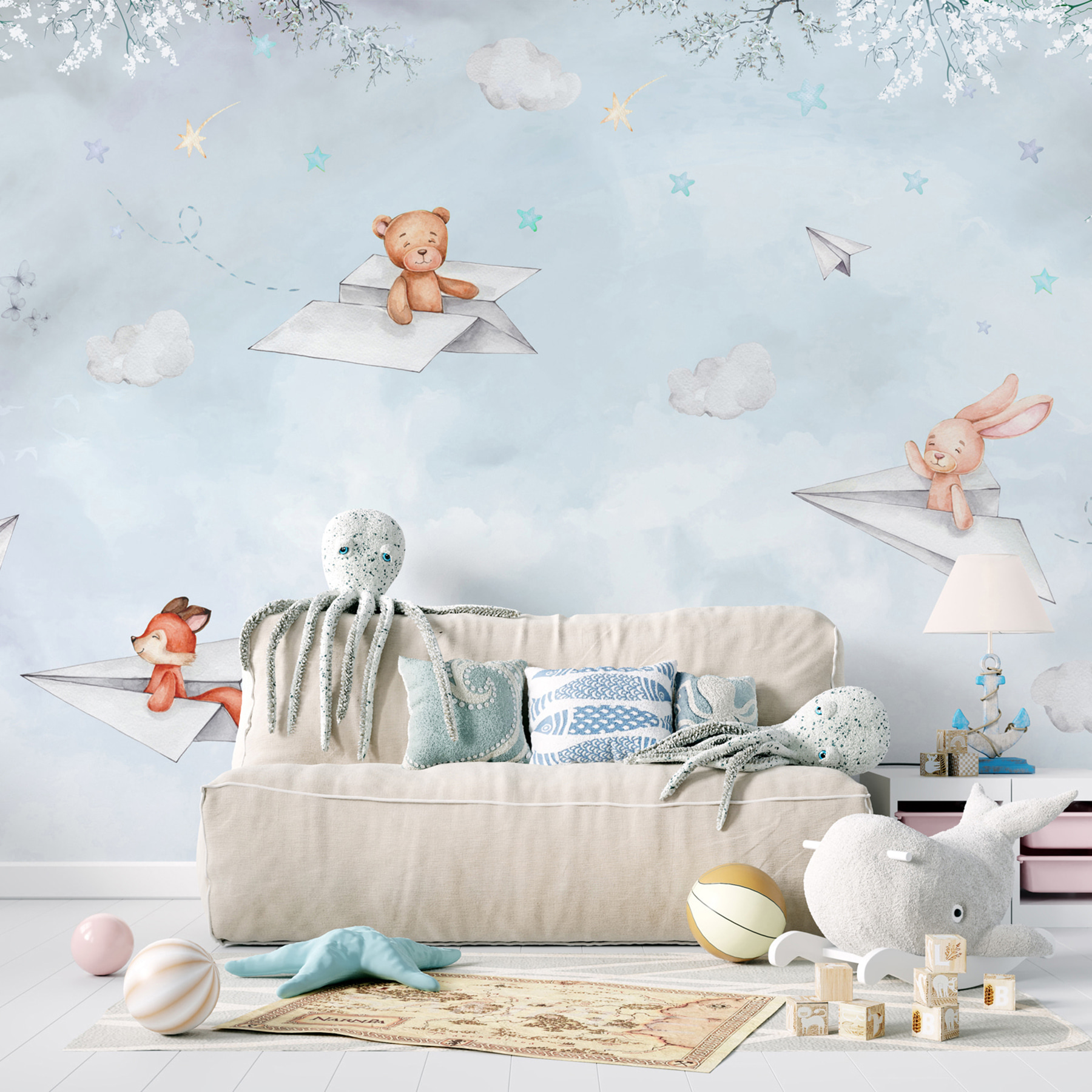 Wyobraź to sobie: kapryśne zwierzęta szybujące po sennym niebie, jeżdżące na papierowych samolotach – jakie to zachwycające? Fototapeta ścienna “Whimsical Animals Soaring in Sky” wyniesie pokój twojego dziecka na nowy poziom. Urocze małe zwierzątka, takie jak niedźwiedź, króliczek i lis, pędzą przez chmury i gwiazdy. To jak bajka na dobranoc, idealna do pobudzenia wyobraźni i słodkich snów. Niezależnie od tego, czy dekorujesz pokój dziecięcy, czy dodajesz magiczny akcent do pokoju zabaw, delikatne kolory i uroczy design tej fototapety przynoszą niekończące się uśmiechy i poczucie zachwytu. Piękne tło dla każdej przestrzeni, która ma oczarowywać i inspirować. ✨