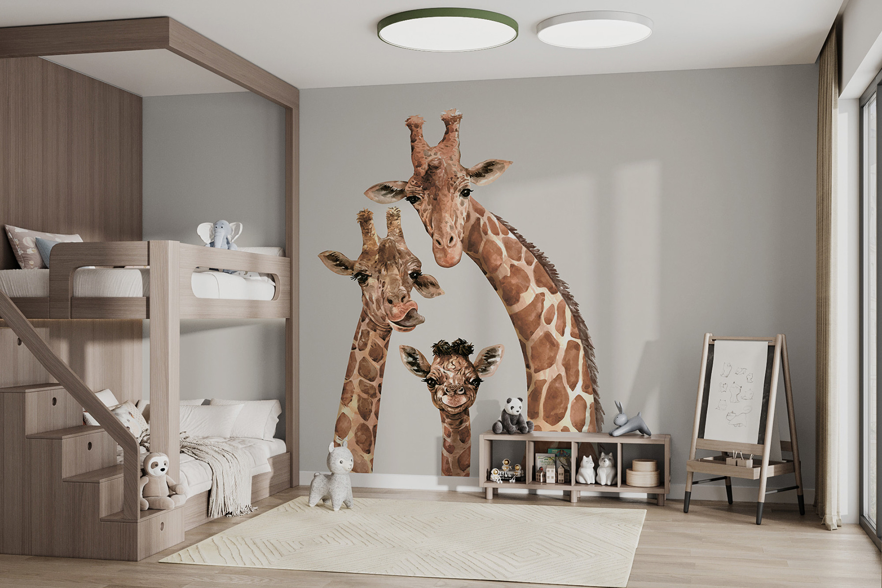 Oto odrobina zabawy i kaprysu dla twoich ścian – nasza “Fototapeta ścienna Grupa żyraf z głowami razem” doda odrobinę osobowości do każdego pomieszczenia. Wystarczy spojrzeć na te urocze, zaciekawione twarze! Niezależnie od tego, czy urządzasz pokój dziecięcy, czy po prostu lubisz zabawne dekoracje, te żyrafy z pewnością wywołają uśmiech na twojej twarzy za każdym razem, gdy je zobaczysz.