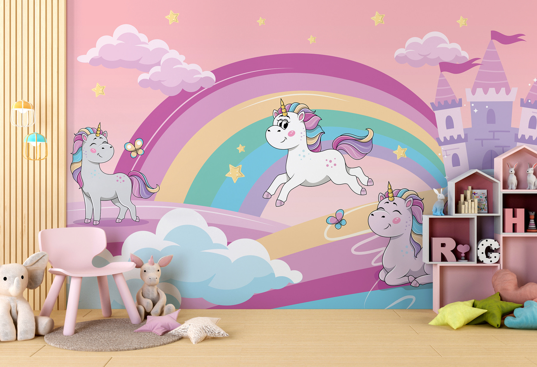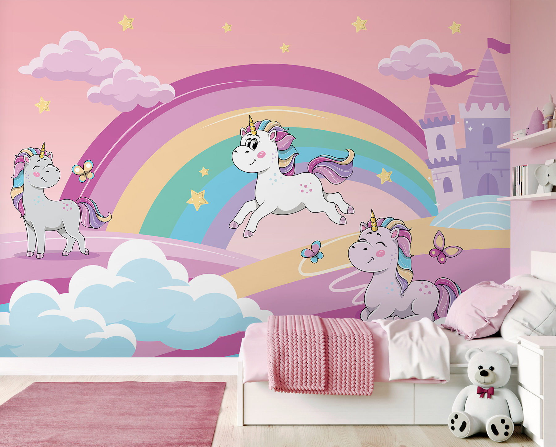 Przekształć każdy zwykły pokój w kapryśną ucieczkę dzięki tej uroczej fototapecie z jednorożcem! Wyobraź sobie motyle tańczące wokół kolorowych tęcz, podczas gdy figlarne jednorożce tańczą pod delikatnym różowym niebem. To jak wejście do bajki, w której magia jest na wyciągnięcie ręki. Idealna do pobudzenia wyobraźni malucha, ta fototapeta daje przytulny, zabawny nastrój, sprawiając, że każdy dzień staje się przygodą. Z pewnością wywoła uśmiech i chichot, a także odrobinę radości za każdym razem, gdy wejdzie do domu. Kto nie chciałby odrobiny bajkowej magii na swoich ścianach?