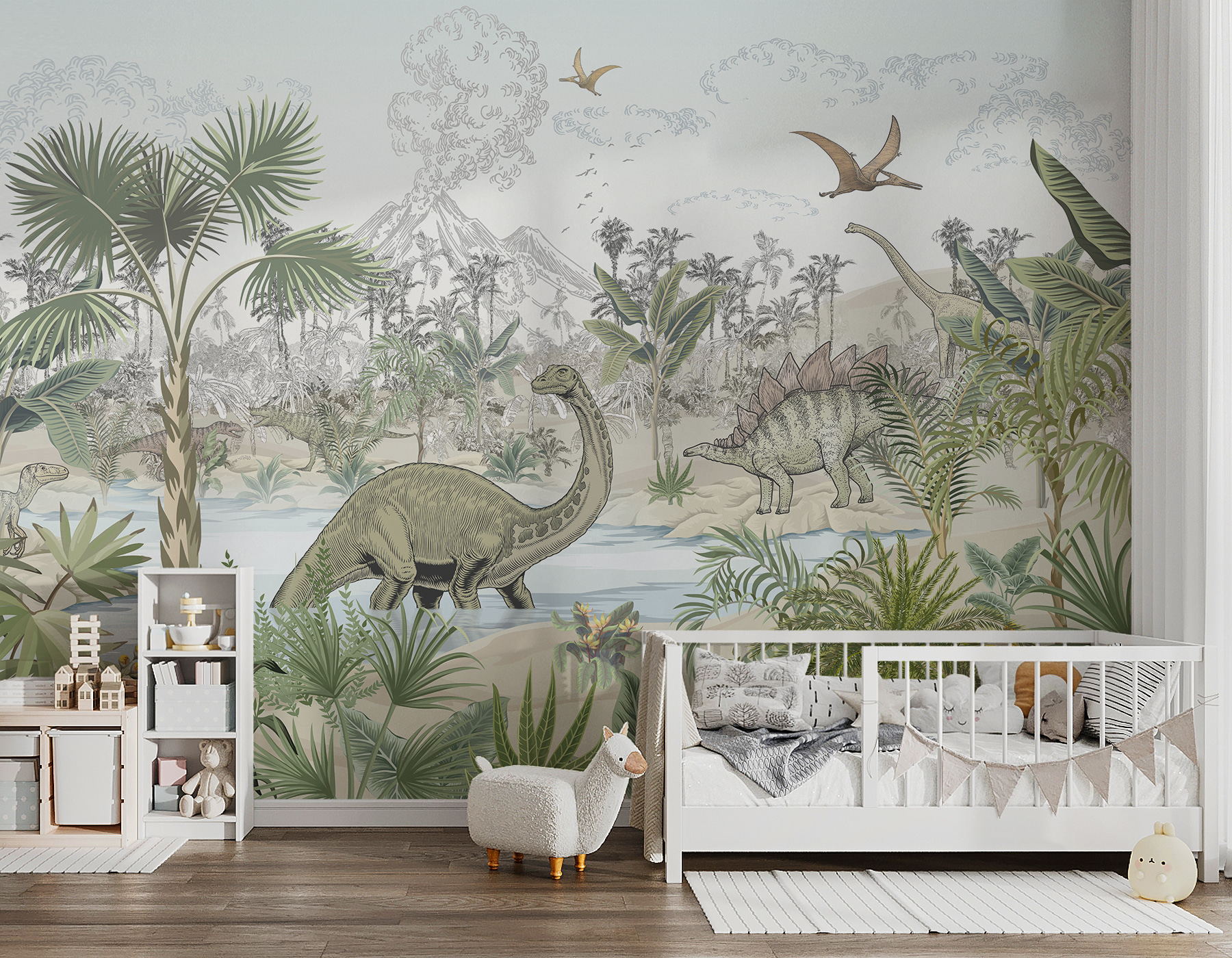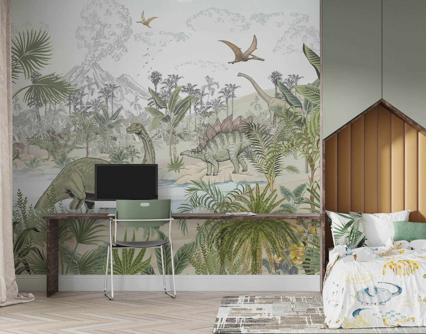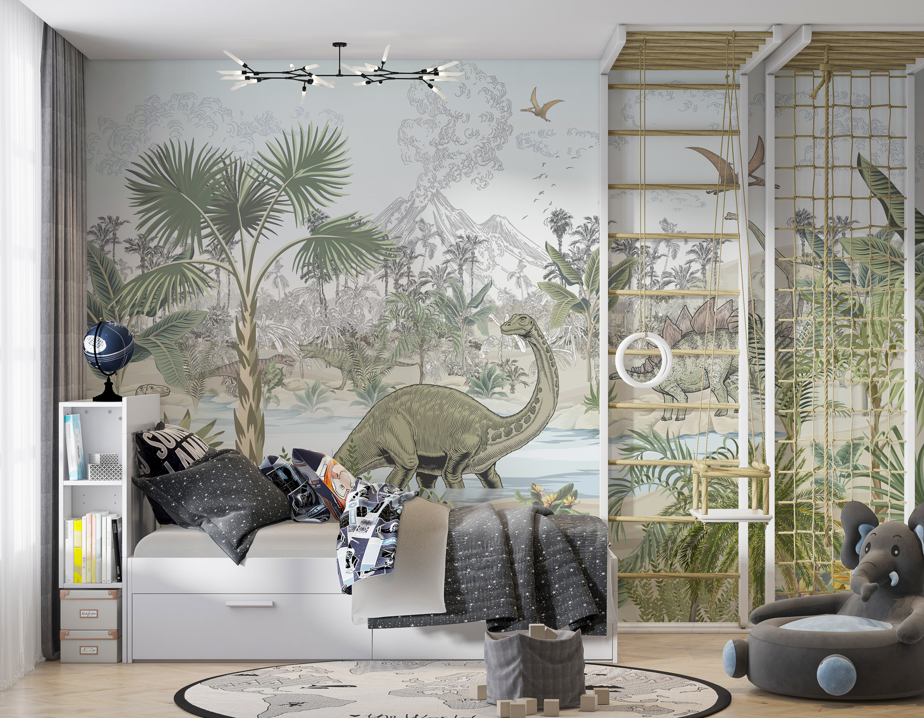 Przekształć przestrzeń dziecka w prehistoryczny raj dzięki tej tętniącej życiem fototapecie przedstawiającej majestatyczne dinozaury wędrujące po swoim bujnym tropikalnym domu. Wyobraź sobie ekscytację, gdy maluchy patrzą na te łagodne olbrzymy, odkrywając ich fantastyczny świat. Z kołyszącymi się palmami i dmuchającym wulkanem w tle, ta fototapeta pobudza wyobraźnię i przygody, które wykraczają poza bajki na dobranoc.