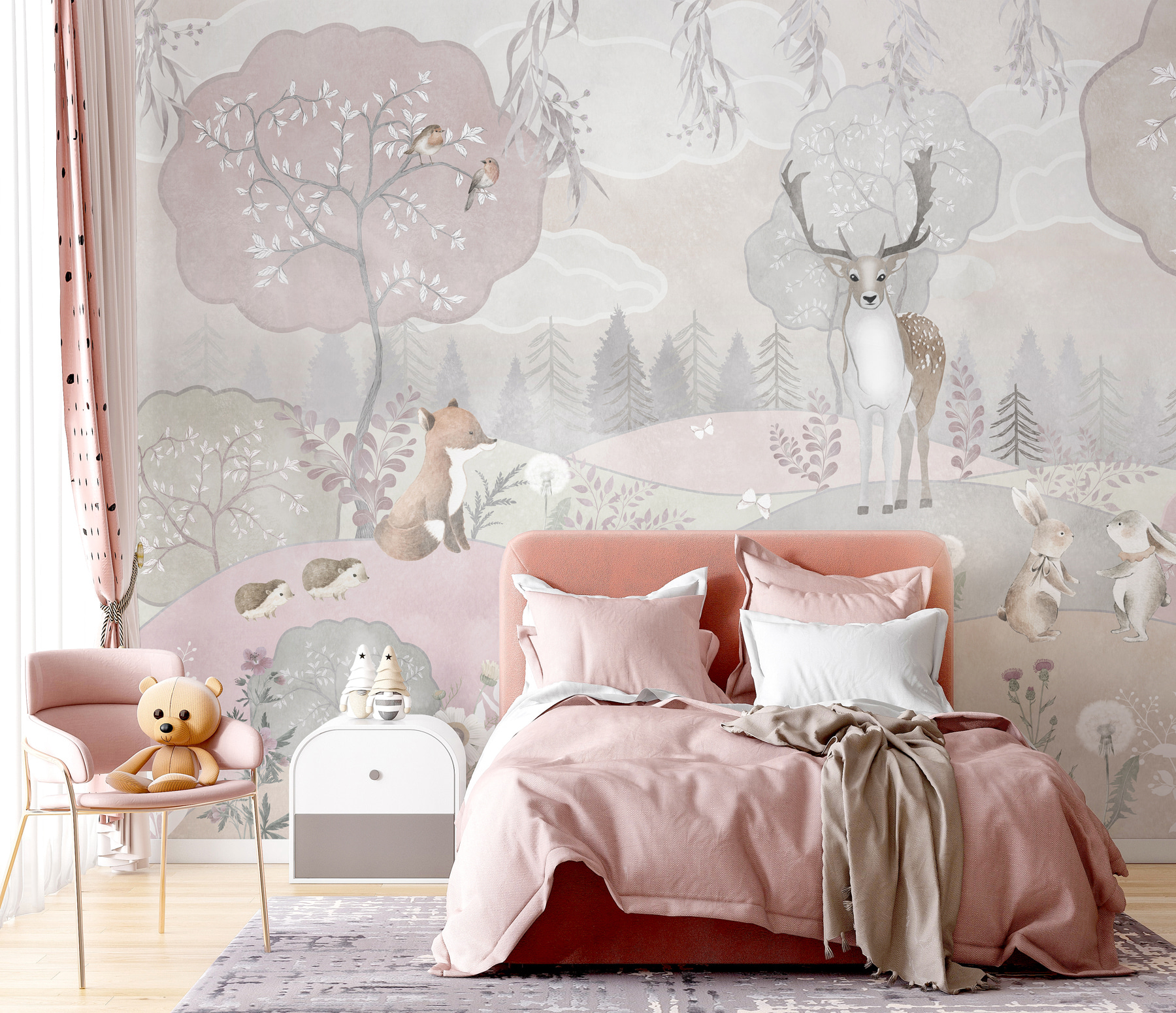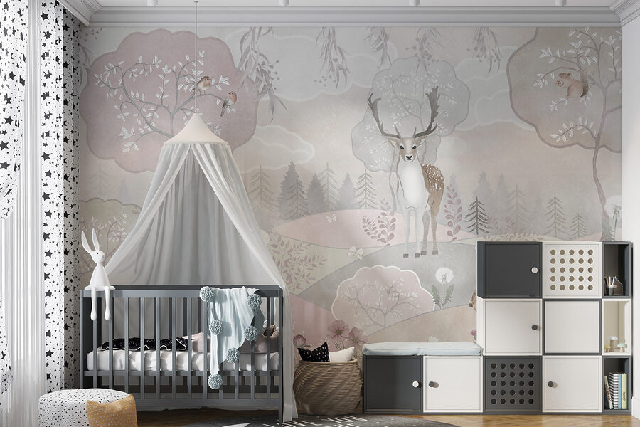 Wyobraź sobie, że wkraczasz do kapryśnego lasu, w którym majestatyczny jeleń stoi z gracją wśród figlarnych króliczków i ciekawskich małych lisków. Ta fototapeta ścienna to nie tylko element wystroju; to drzwi do uroczej bajkowej scenerii. Delikatne pastelowe kolory tworzą spokojne tło, które zaprasza spokój i radość do każdej przestrzeni. Idealny do pokoju dziecięcego lub dowolnego zakątka potrzebującego odrobiny magii, z pewnością wywoła rozmowy i uśmiechy. Wyobraź sobie przygody, które rozgrywają się pod czujnym okiem tych stworzeń, przypominając wszystkim, że nawet najprostsze chwile mogą być czystym czarem. Przekształć swoje ściany w płótno wyobraźni!