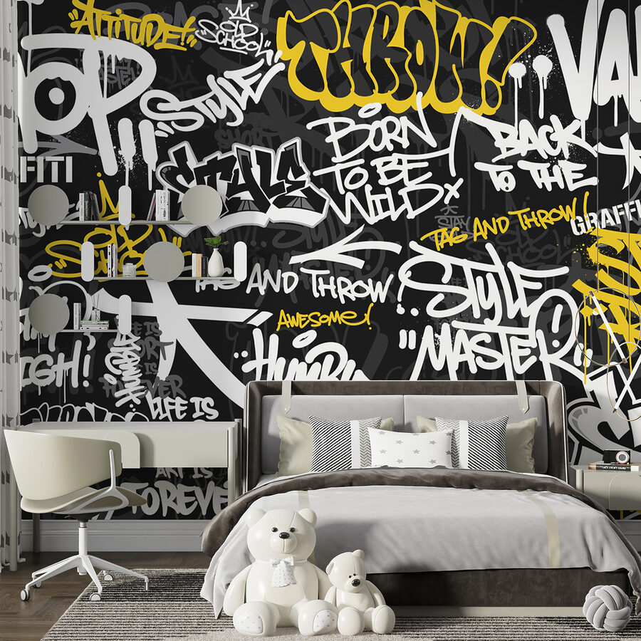 Ta fototapeta ścienna “Żółte graffiti na czarnym tle” jest totalnie klimatyczna. Idealna do dodania odrobiny ostrego, miejskiego chłodu do każdej przestrzeni. Wyobraź sobie, że pokój nastolatka nagle zaczyna przypominać śródmiejską alejkę w najlepszy możliwy sposób – pełen młodzieńczej energii i buntowniczego ducha. To jak przeniesienie sztuki ulicznej do wnętrza bez oparów farby w sprayu! Ponadto połączenie żółtego i czarnego jest naprawdę uderzające i dodaje nieoczekiwanego popu, który może obudzić pokój. Zaskakująco wyrafinowana, a jednocześnie całkowicie świeża, ta fototapeta jest idealna dla każdego młodego lub po prostu młodego duchem, który chce, aby jego ściany mówiły wiele.