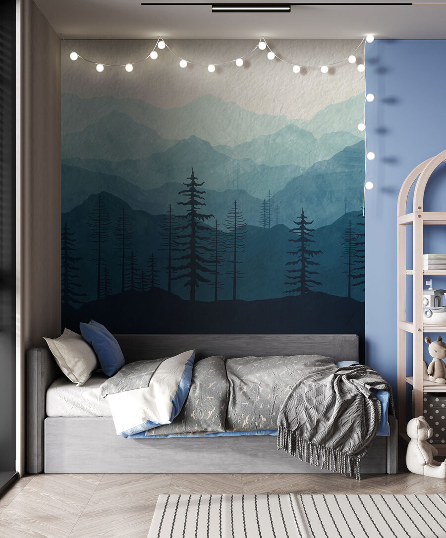 Czy kiedykolwiek marzyłeś o przebudzeniu się w przytulnym domku położonym w sercu głębokiego, spokojnego lasu? Ta fototapeta ścienna “Sylwetka drzewa” to twój ekspresowy bilet do spokoju bez wychodzenia z domu. Wyobraź sobie akwarelowe warstwy majestatycznych gór i wysokich, spokojnych drzew rozciągających się na całej ścianie, niemal szepcząc spokój i sekrety natury do twojej przestrzeni.