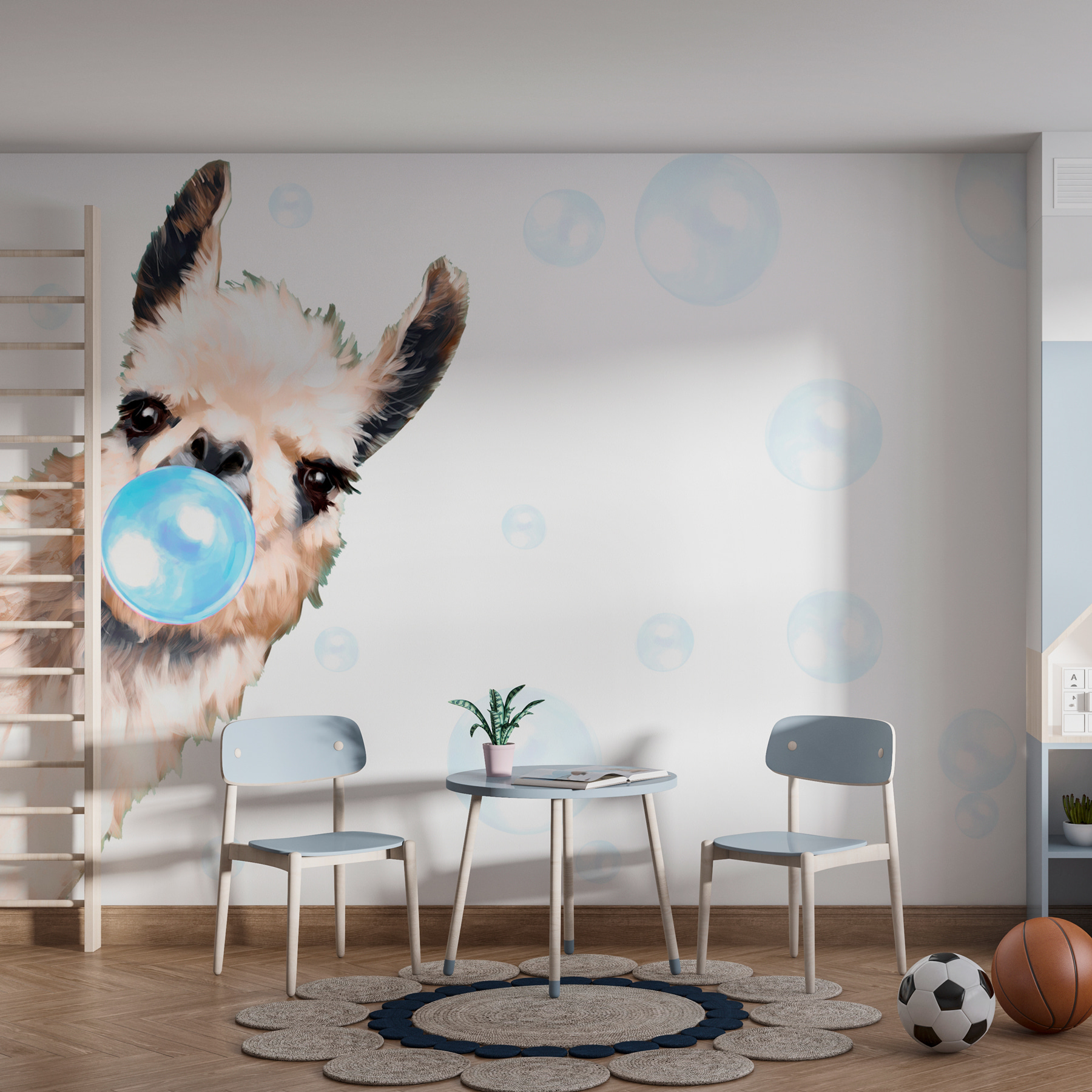 Wprowadź odrobinę kaprysu do każdego pomieszczenia dzięki fototapecie ściennej “Llama dmucha bańkę”. Poważnie, czy może być bardziej urocza? Wyobraź sobie, że wracasz do domu i widzisz tę dziwaczną lamę, która chłodno dmucha w jasnoniebieską bańkę, wywołując u ciebie bardzo chłodny nastrój. Idealny dla nastolatków, młodych ludzi lub każdego, kto jest młody duchem. Ten zabawny nadruk nadaje się do sypialni lub miejsca spotkań, gdzie z pewnością wywoła uśmiech i może chichot lub dwa. A te puszyste uszy – totalne przeciążenie słodyczą. Jest to rodzaj sztuki, która zamienia każdą ścianę w początek rozmowy. Życie jest zbyt krótkie na nudne ściany!