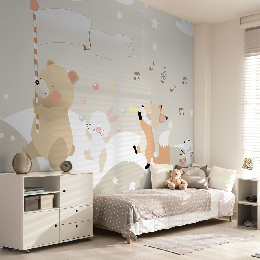 Przekształć pokój dziecka w kapryśną krainę czarów dzięki tej zachwycającej fototapecie przedstawiającej wesołego misia i jego wesołą bandę leśnych przyjaciół. Wyobraź sobie, że maluchy budzą się w zabawnej scenerii, w której miś macha laską jak flagą, zapraszając do snów pełnych słodyczy i zabawy. Obok tańczy lisek i podskakuje króliczek; to jak mała parada na ścianie! Delikatne kolory i radosne wyrażenia tworzą kojącą atmosferę, pobudzając wyobraźnię i śmiech. Idealny do pokoju zabaw lub pokoju dziecięcego, to rodzaj dekoracji, która zamienia codzienne chwile w przygodę – kto wie, jakie historie się tu rozwiną? Prosty akcent, który robi duże wrażenie!