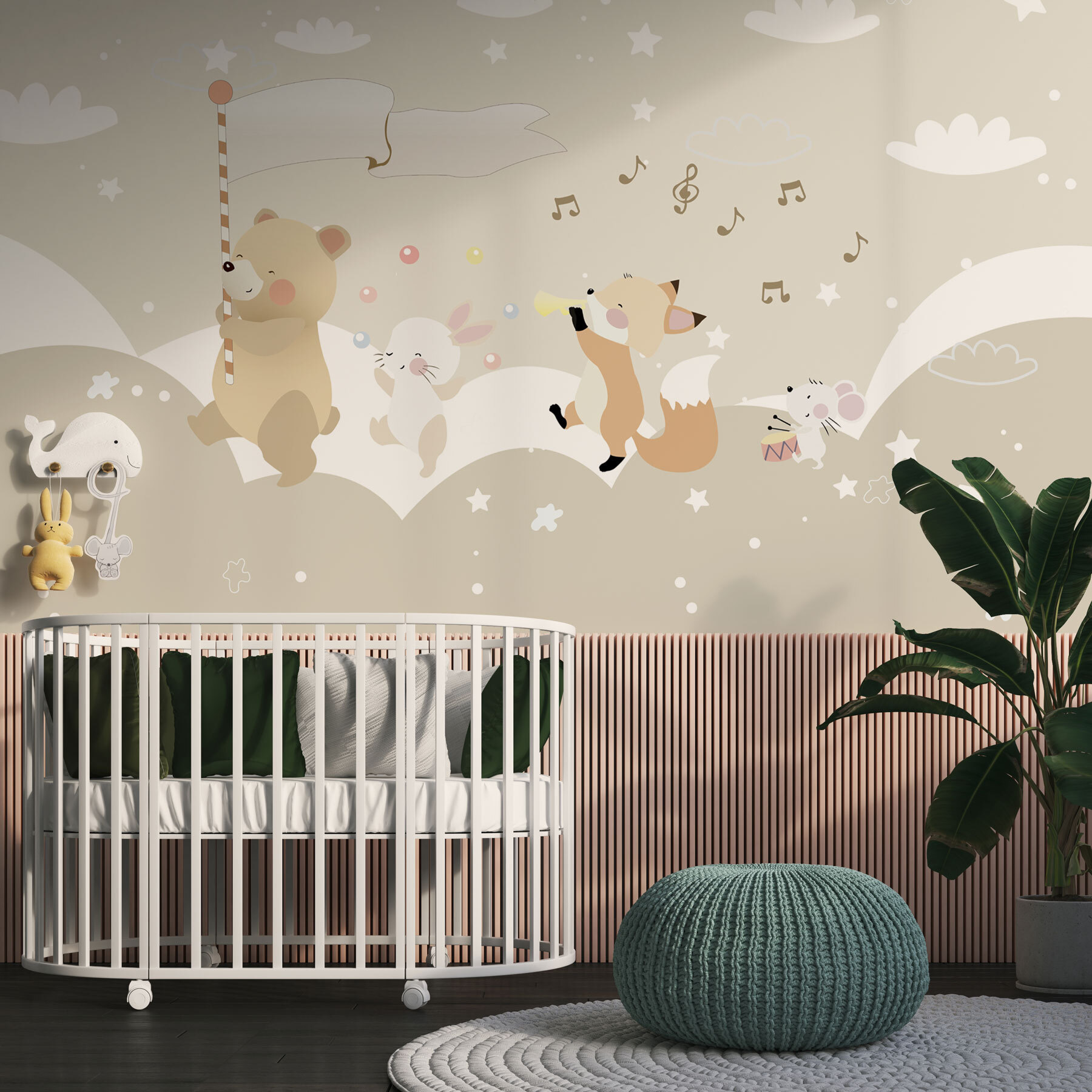 Przekształć pokój dziecka w kapryśną krainę czarów dzięki tej zachwycającej fototapecie przedstawiającej wesołego misia i jego wesołą bandę leśnych przyjaciół. Wyobraź sobie, że maluchy budzą się w zabawnej scenerii, w której miś macha laską jak flagą, zapraszając do snów pełnych słodyczy i zabawy. Obok tańczy lisek i podskakuje króliczek; to jak mała parada na ścianie! Delikatne kolory i radosne wyrażenia tworzą kojącą atmosferę, pobudzając wyobraźnię i śmiech. Idealny do pokoju zabaw lub pokoju dziecięcego, to rodzaj dekoracji, która zamienia codzienne chwile w przygodę – kto wie, jakie historie się tu rozwiną? Prosty akcent, który robi duże wrażenie!
