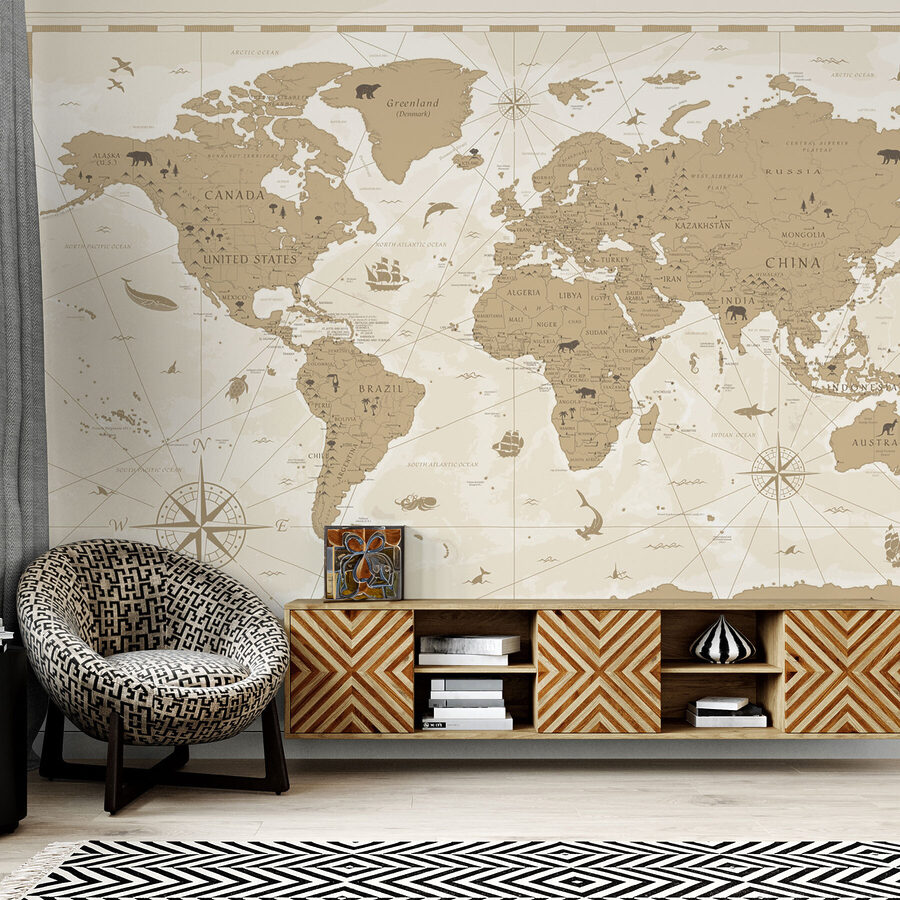 Pomyśl o tym – codzienna lekcja geografii bezpośrednio z kanapy. Dzieci mogą marzyć o odległych miejscach, a dorośli? Cóż, może to po prostu rozpalić żądzę wędrówki lub przypomnieć o ostatniej wielkiej podróży. Stonowane odcienie sprawiają, że bez trudu komponuje się z każdym wystrojem. Ponadto, są tu wszystkie te zabawne małe szczegóły – zwierzęta, statki i te oldschoolowe róże kompasu – które dodają odrobinę uroku vintage. To nie jest zwykła fototapeta; to jak gigantyczna książka z opowieściami na ścianie. Absolutnie idealna dla każdego, kto pasjonuje się przygodami.