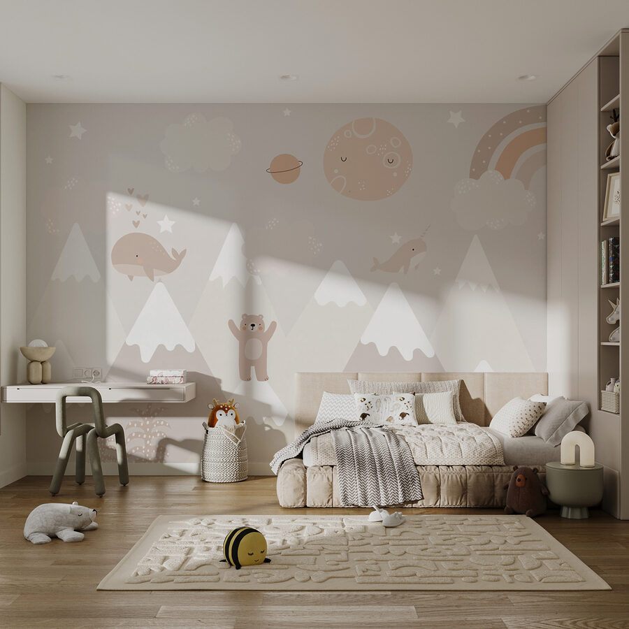 Ta zachwycająca fototapeta ścienna “Cartoon Whale with Stars” jest jak wejście w kapryśny sen! Idealna do pokoju dziecięcego, pokoju dziecinnego lub dowolnej przestrzeni do zabawy, wprowadza przytulną, magiczną atmosferę, która jest zarówno uspokajająca, jak i zabawna. Wyobraź sobie swoje maluchy zasypiające pod uśmiechniętym księżycem, z przyjaznymi wielorybami i narwalami unoszącymi się wśród gwiazd – czysta magia bajki na dobranoc! Delikatne pastelowe odcienie i słodkie postacie tworzą spokojną, zachęcającą atmosferę, dzięki czemu jest to wspaniałe tło do przytulania lub zabawy. Daj się oczarować i pozwól, by ta czarująca scena rozbudziła radość i kreatywność w Twojej przestrzeni!