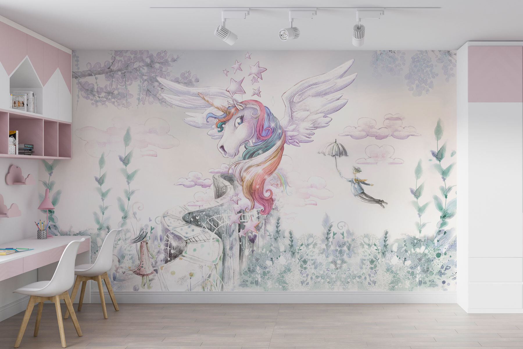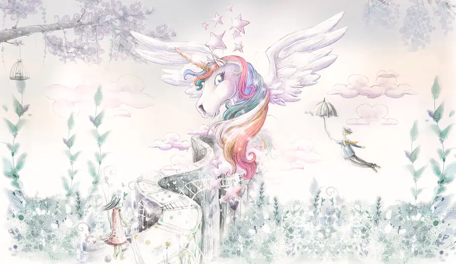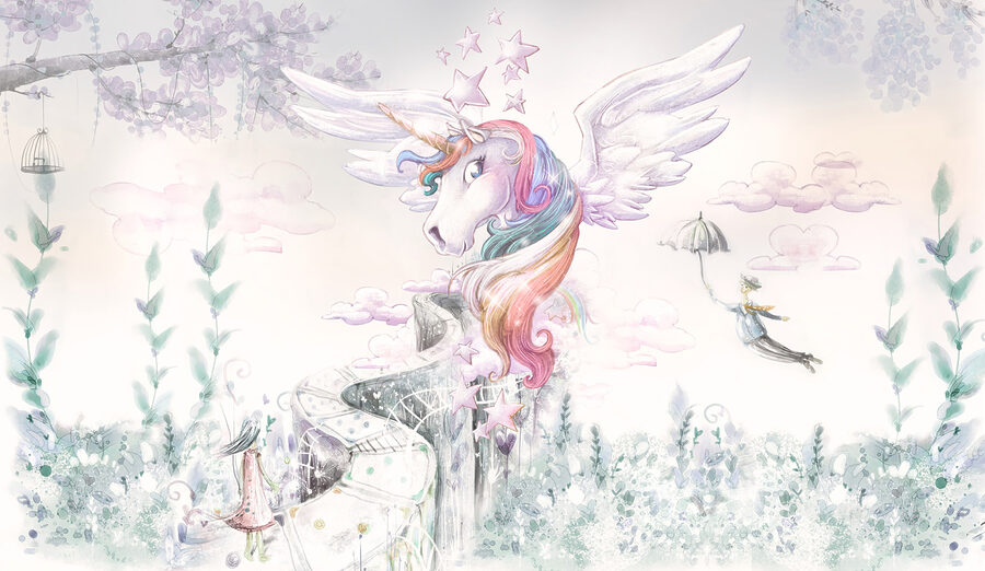 Szukasz odrobiny magii w pokoju swojego dziecka? Sprawdź tę fototapetę “Jednorożec ze skrzydłami i tęczowymi włosami”! Wyobraź sobie, że budzisz się w scenerii prosto z bajki – kapryśny jednorożec ze spływającymi pastelowymi tęczowymi włosami, otoczony miękkimi chmurami i migoczącymi gwiazdami. To jak marzenie każdego dziecka, namalowane na jego ścianie! Ta fototapeta pięknie pasuje do żłobków i pokoi małych dzieci, sprawiając, że czują się, jakby wskoczyły do swojej ulubionej bajki. Słodko stonowana, a jednocześnie całkowicie czarująca – wywołuje radość i niekończące się opowieści. Idealny do krainy czarów malucha lub przystani każdego miłośnika jednorożców! 🌈🦄