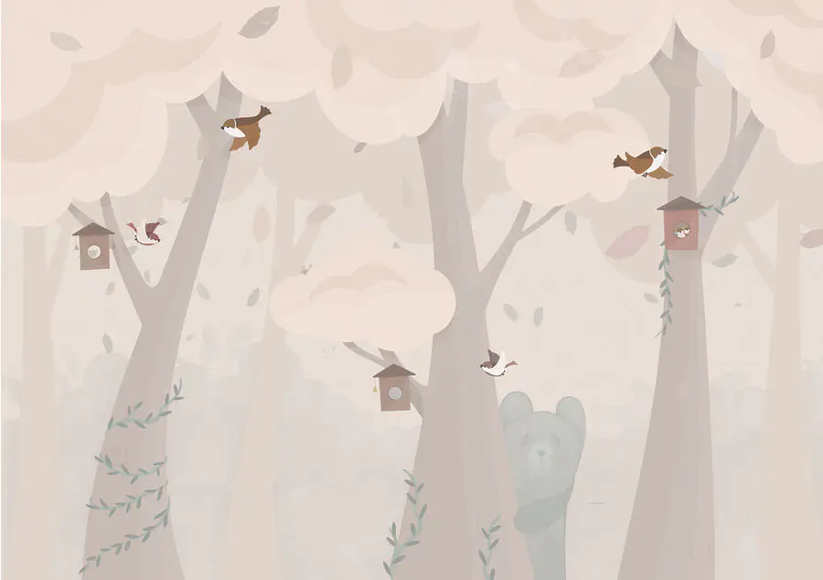 Twoje dzieci będą uwielbiać dostrzegać ptaki i budki dla ptaków, a może nawet wymyślać historie o uroczych stworzeniach w nich mieszkających. Dodatkowo, na zewnątrz zerka podstępny niedźwiedź, nadając całej scenerii przyjazny klimat. Za każdym razem, gdy wchodzisz do środka, czujesz się jak w bajce! Ta fototapeta to nie tylko dekoracja; to cały magiczny świat, który zachęca do wyobraźni i opowiadania historii.