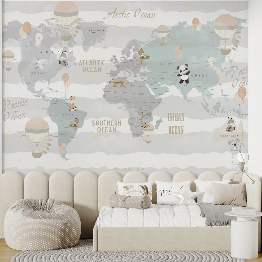 Ta urocza fototapeta ścienna “Hot Air Balloon in the Sky” porwie wyobraźnię twojego dziecka na magiczną przygodę. Wyobraź sobie mapę świata, pięknie miękką i pastelową, pokrytą najsłodszymi zwierzątkami w balonach na gorące powietrze – jest nawet figlarna panda i ciekawska żyrafa! To jak globalne safari na ścianie. Idealna do pokoju dziecięcego, ta fototapeta zachęca do podziwiania wielkiego, szerokiego świata. Z pewnością zainspiruje do snucia opowieści o lataniu nad lśniącymi oceanami i lądowaniu w odległych krainach. Idealna dla małych odkrywców – rodzice też mogą przyłapać się na marzeniach. Jest przytulny, kapryśny i pełen uroku – dokładnie to, czego potrzebuje przestrzeń każdego dziecka!
