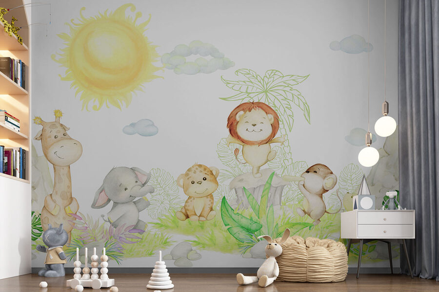Rodzice uwielbiają go, ponieważ jest zabawny, ale nie przytłaczający. Kojące kolory i radosne twarze tworzą uspokajającą, ale zabawną atmosferę. Wyobraź sobie bajki na dobranoc pod tą fototapetą – czujesz się prawie tak, jakbyś czytał w magicznej dżungli. Podglądający żółw i mały lew z pewnością wywołają niezliczone przygody podczas zabawy! Natychmiastowa zmiana nastroju w każdym pokoju dziecięcym lub pokoju zabaw, z pewnością sprawi, że zarówno dzieci, jak i dorośli będą się uśmiechać za każdym razem, gdy wejdą do pokoju.