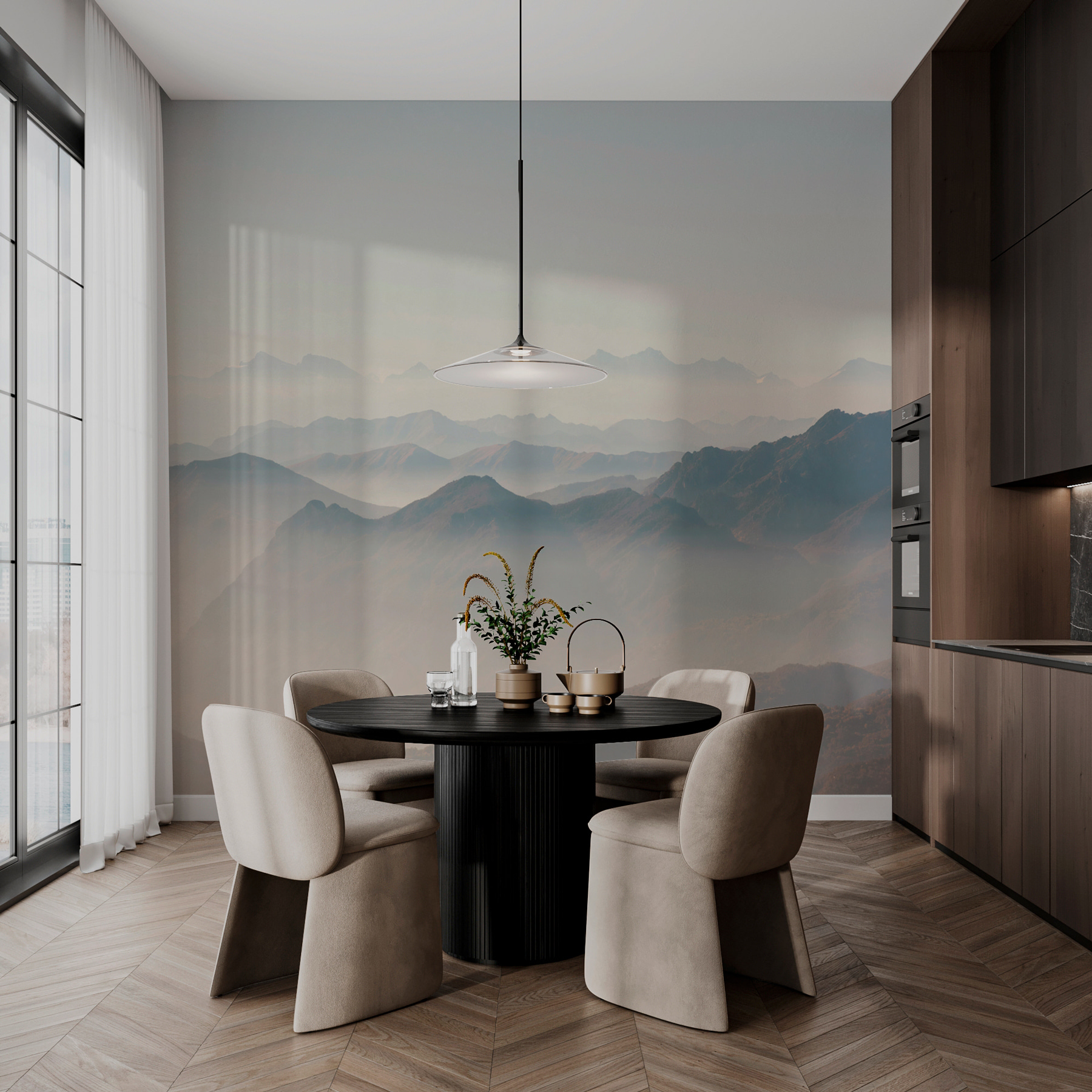 Przekształć dowolną przestrzeń w spokojną ucieczkę dzięki tej oszałamiającej fototapecie przedstawiającej pasmo górskie spowite mgłą. Wyobraź sobie popijanie kawy w leniwy niedzielny poranek, wpatrując się w te miękkie, falujące szczyty. To jak mini-wakacje dla ścian. Stonowane kolory wywołują poczucie spokoju, idealne do przytulnego salonu lub zacisznej sypialni. Wyobraź sobie tę fototapetę tworzącą tło, które pobudza marzenia o świeżym powietrzu i górskich wędrówkach, a wszystko to bez konieczności zakładania butów turystycznych. To dekoracja, która opowiada historię, wprowadzając naturę do wnętrza z szeptem przygody.