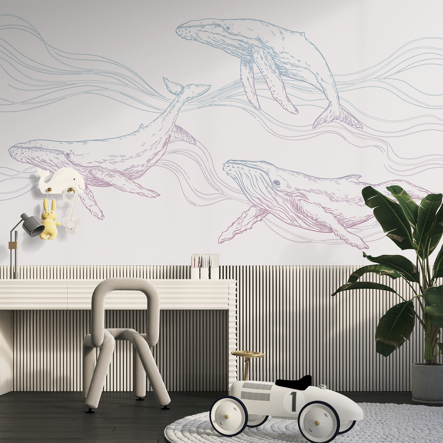 Przekształć dowolny pokój w oceaniczną ucieczkę dzięki tej oszałamiającej fototapecie ściennej przedstawiającej grupę wielorybów z gracją płynących przez wodę. Wyobraź sobie, że budzisz się w delikatnej, kojącej obecności tych majestatycznych stworzeń, z których każde przypomina o pięknie głębokiego błękitu. Miękkie, płynne linie i pastelowe odcienie tworzą spokojną atmosferę – idealną do przytulnego salonu lub uspokajającej sypialni. To tak, jakby mieć kawałek morza w domu. Przyjaciele będą podziwiać sztukę, a kto nie poczuje się bardziej zrelaksowany w otoczeniu gigantów natury? Zanurz się w świecie, który przenosi cuda oceanu do Twojego codziennego życia.