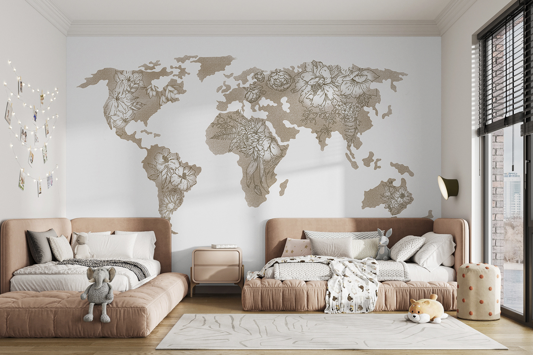 Masz w domu małego podróżnika lub po prostu uwielbiasz wyjątkowe dekoracje? Sprawdź tę “ścienną mapę świata”. To nie jest typowa mapa – ziemia łączy się z kwiatowym kunsztem! Wyobraź sobie swoje dzieci marzące o przygodach na całym świecie, wpatrując się w to piękno na ścianie. Wyraziste detale botaniczne są umieszczone bezpośrednio na kontynentach, dzięki czemu geografia przypomina galerię sztuki. Idealny do pokoju dziecięcego lub dowolnej przestrzeni, w której odrobina natury spotyka się z pragnieniem wędrówki. Poważnie, przyciąga wzrok i zachęca do rozmowy w jednym. Idealny, aby pobudzić ciekawość lub pokazać swoją miłość do świata w najbardziej elegancki, artystyczny sposób!