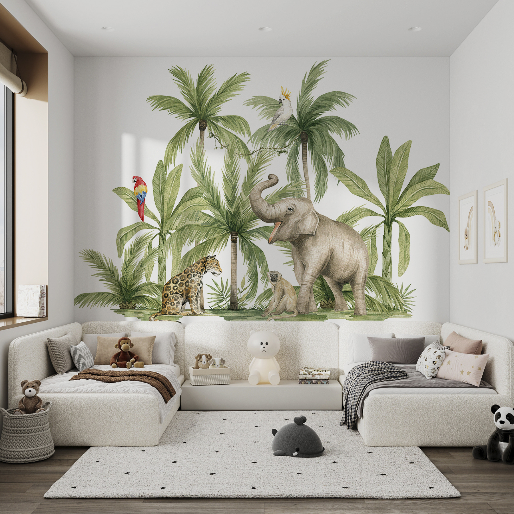 Przekształć dowolny pokój w tętniącą życiem przygodę w dżungli dzięki tej kapryśnej fototapecie ściennej przedstawiającej zabawne zwierzęta wśród kołyszących się palm. Wyobraź sobie, że wchodzisz do pomieszczenia, w którym wita cię słoń, bezczelna małpka i kolorowa papuga – kto by się nie uśmiechnął? Idealny do pokoju dziecięcego lub nawet przytulnego kącika w salonie, dodaje odrobinę uroku natury. Poza tym, kto mógłby oprzeć się kojącej atmosferze bujnej zieleni? Usiądź wygodnie i pozwól, aby ta scena z dżungli wywołała radość i śmiech, zamieniając codzienne chwile w mini przygody. Daj się ponieść dzikiej naturze, choćby na chwilę!