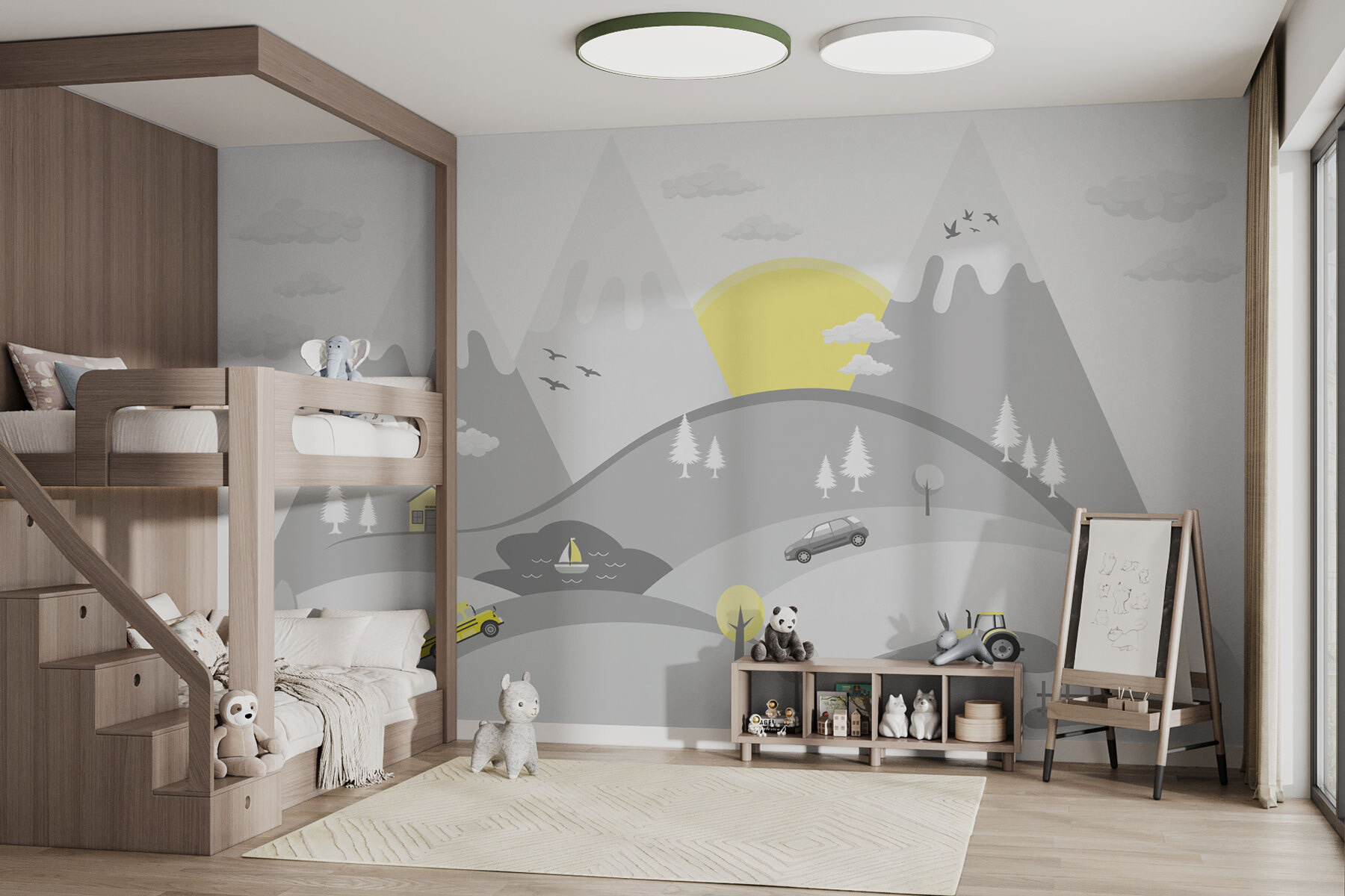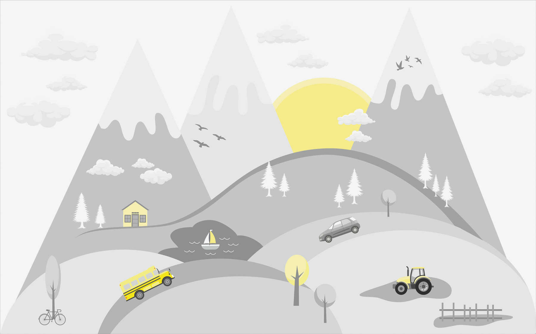 Czy kiedykolwiek myślałeś, że żółty autobus szkolny może dodać tyle uroku do pokoju? Ta zachwycająca fototapeta przedstawia wesoły żółty autobus z klasycznymi czarnymi paskami, pędzący malowniczą trasą, która jest prawie zbyt idealna. Wyobraź sobie, jak mogłoby to rozjaśnić pokój dziecka – natychmiast przenosząc je do kapryśnego świata przygód i zabawy! Tło gór, drzew i zabawnych chmur dodaje kojącego akcentu, dzięki czemu idealnie nadaje się również do pokoju dziecięcego. Ten rodzaj grafiki ściennej sprawi, że czas opowiadania lub zabawy będzie o wiele bardziej magiczny. Powieś ją i obserwuj, jak ich wyobraźnia bierze górę!