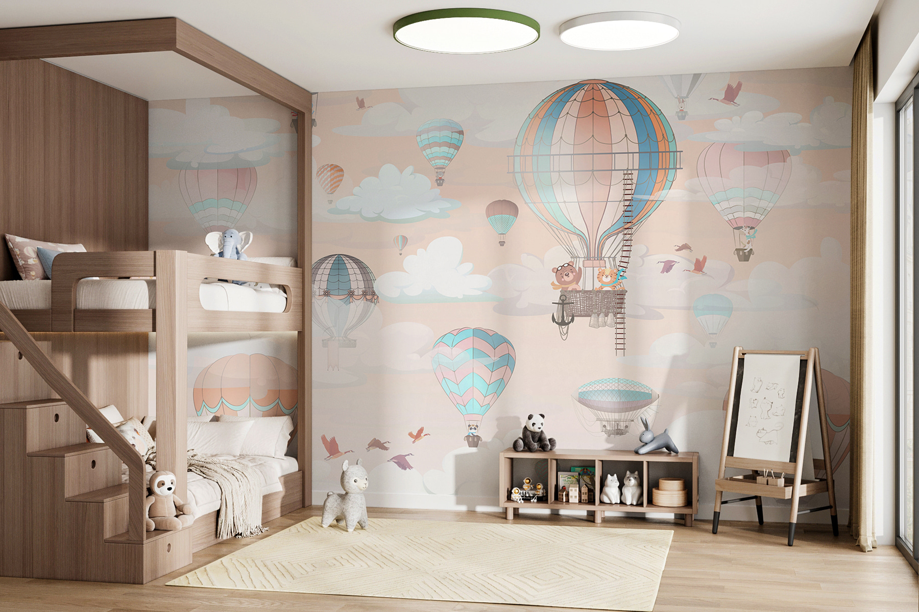 Ta fototapeta ścienna “Hot Air Balloon in the Sky” jest jak sen na jawie. Wyobraź sobie dzieci budzące się każdego ranka na niebie pełnym kapryśnych balonów na gorące powietrze, unoszących się przez puszyste chmury. To urocza mieszanka delikatnych pastelowych kolorów – idealna do stworzenia pogodnej, radosnej przestrzeni. Wyobraź sobie bajki na dobranoc osadzone w odległych krainach lub zabawne popołudnia z przyjaciółmi, zainspirowane tą powietrzną przygodą. To nie tylko fototapeta; to cały nastrój – lekki, zabawny i absolutnie magiczny. Idealna do żłobków lub pokojów dziecięcych, wnosząc odrobinę zabawy i niekończącej się wyobraźni.