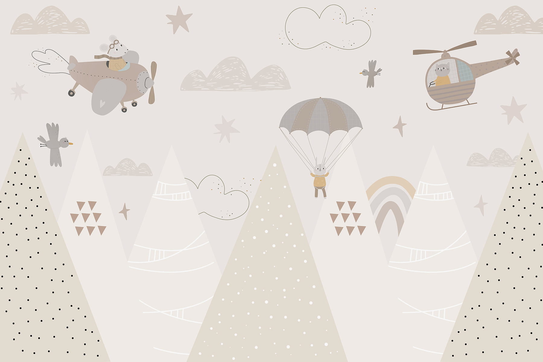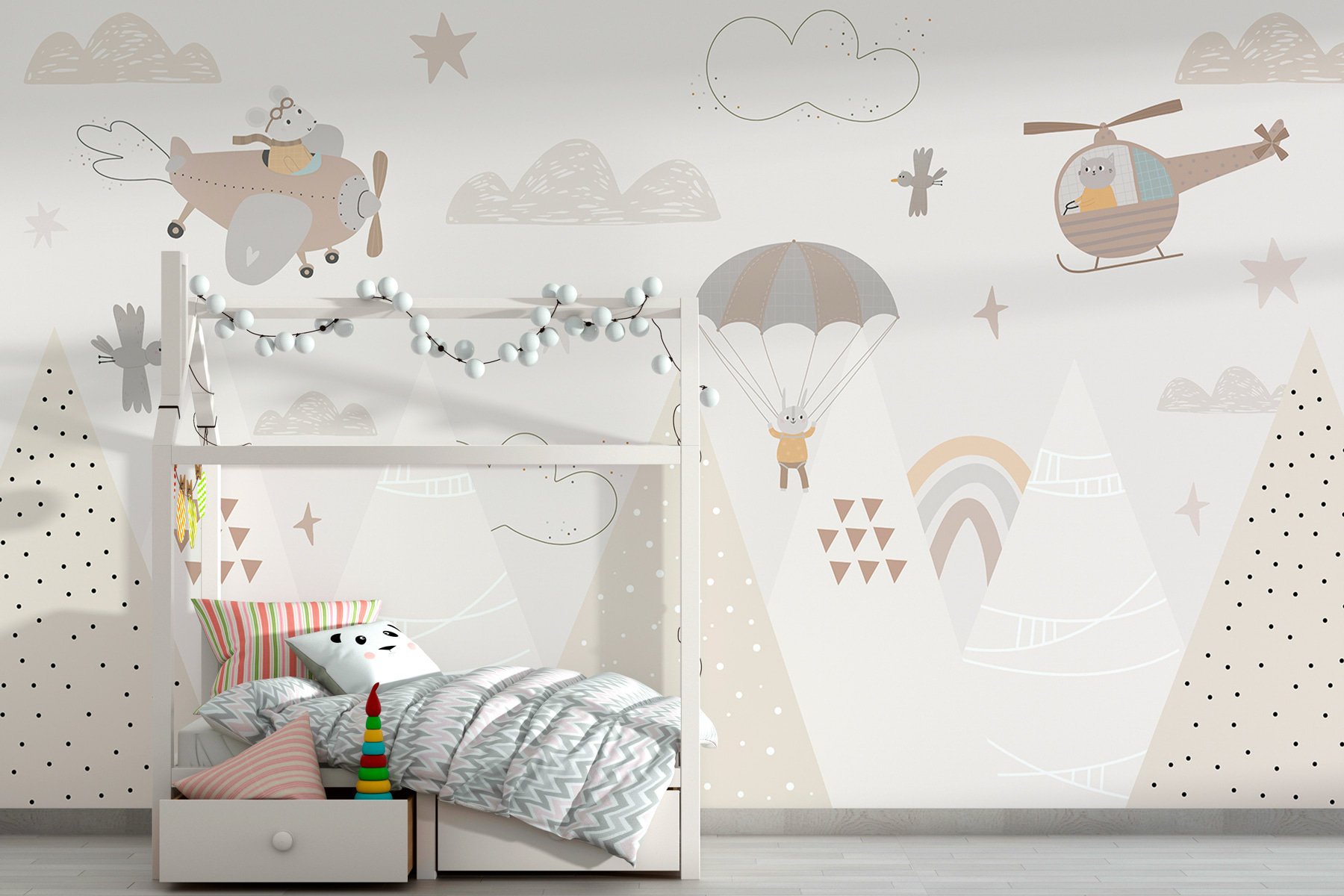 Subtelne, pastelowe kolory i zabawne detale dodają magii wszędzie, gdzie spojrzysz – chmury, gwiazdy, a nawet spadochroniarski króliczek! Można niemal usłyszeć delikatny szum wiatru i wesołe ćwierkanie ptaków. Idealnie nadaje się do rozbudzania wyobraźni małych dzieci, zamieniając bajki na dobranoc w wielkie opowieści o powietrznych eskapadach.