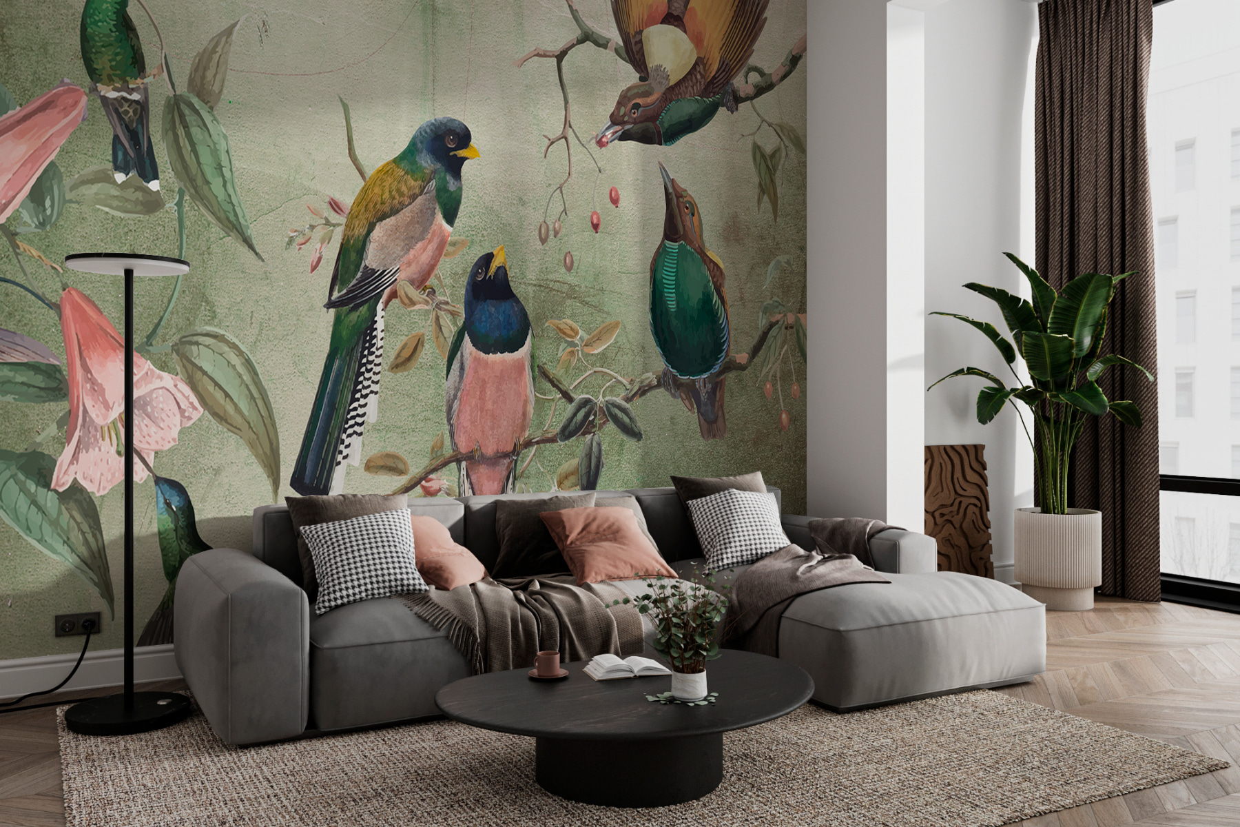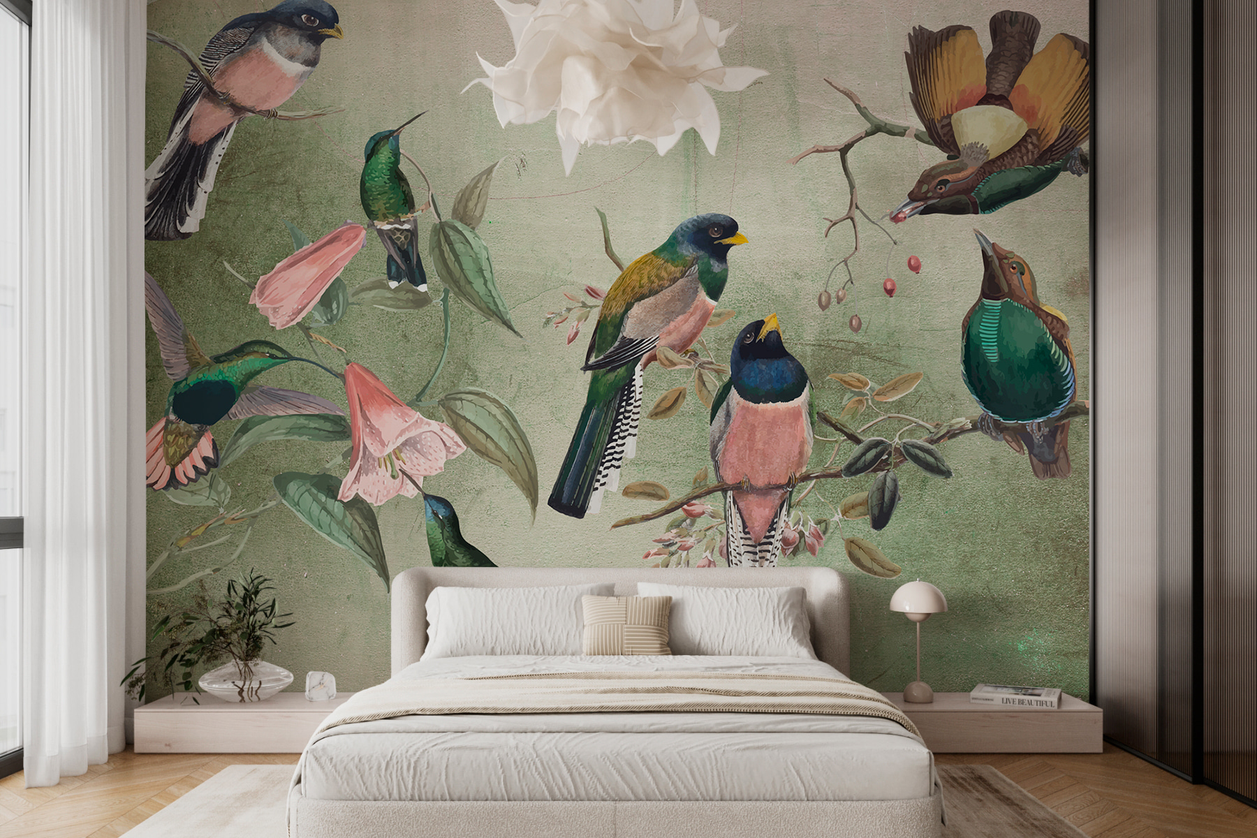 Wyobraź sobie, że budzisz się przy radosnej serenadzie kolorowych ptaków siedzących na gałęziach – bez konieczności opuszczania wygodnego łóżka! Ta fototapeta “Grupa ptaków na gałęzi” jest jak mały kawałek natury w twoim salonie. Urocza mieszanka ptaków i kwiatów daje ten spokojny, ale żywy nastrój, który sprawia, że po prostu chcesz nalać filiżankę herbaty i usiąść na chwilę. Idealna dla miłośników ptaków lub każdego, kto pragnie odrobiny świeżego powietrza w swoim domu. Każde spojrzenie na tę fototapetę to chwila czystej rozkoszy. Bonus: nie musisz się martwić o karmienie tych pierzastych przyjaciół!