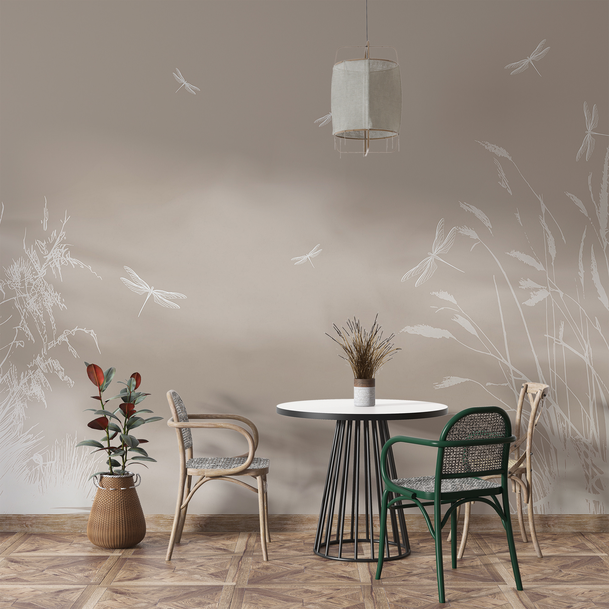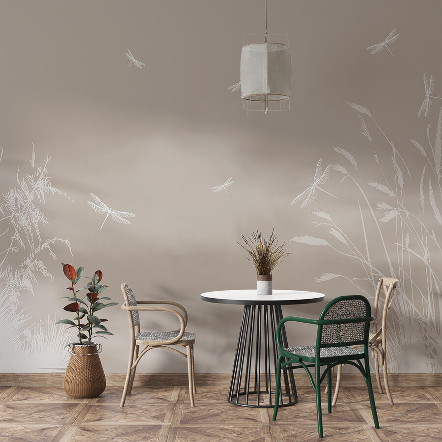 Ta fototapeta to nie tylko dekoracja, ale także sposób na rozpoczęcie rozmowy. Przyjaciele będą wchodzić, robić podwójne spojrzenia i zastanawiać się, czy zainstalowałeś okno na spokojną łąkę. Subtelne kolory tworzą przytulną, ale przewiewną atmosferę, idealną do każdego pomieszczenia, które pragnie odrobiny kaprysu i natury. Dodatkowo, nie ma tu potrzeby posiadania zielonego kciuka – wystarczy spokojna elegancja fruwających ważek. Idealny dla miłośników przyrody lub każdego, kto potrzebuje odrobiny świeżego powietrza w pomieszczeniu.