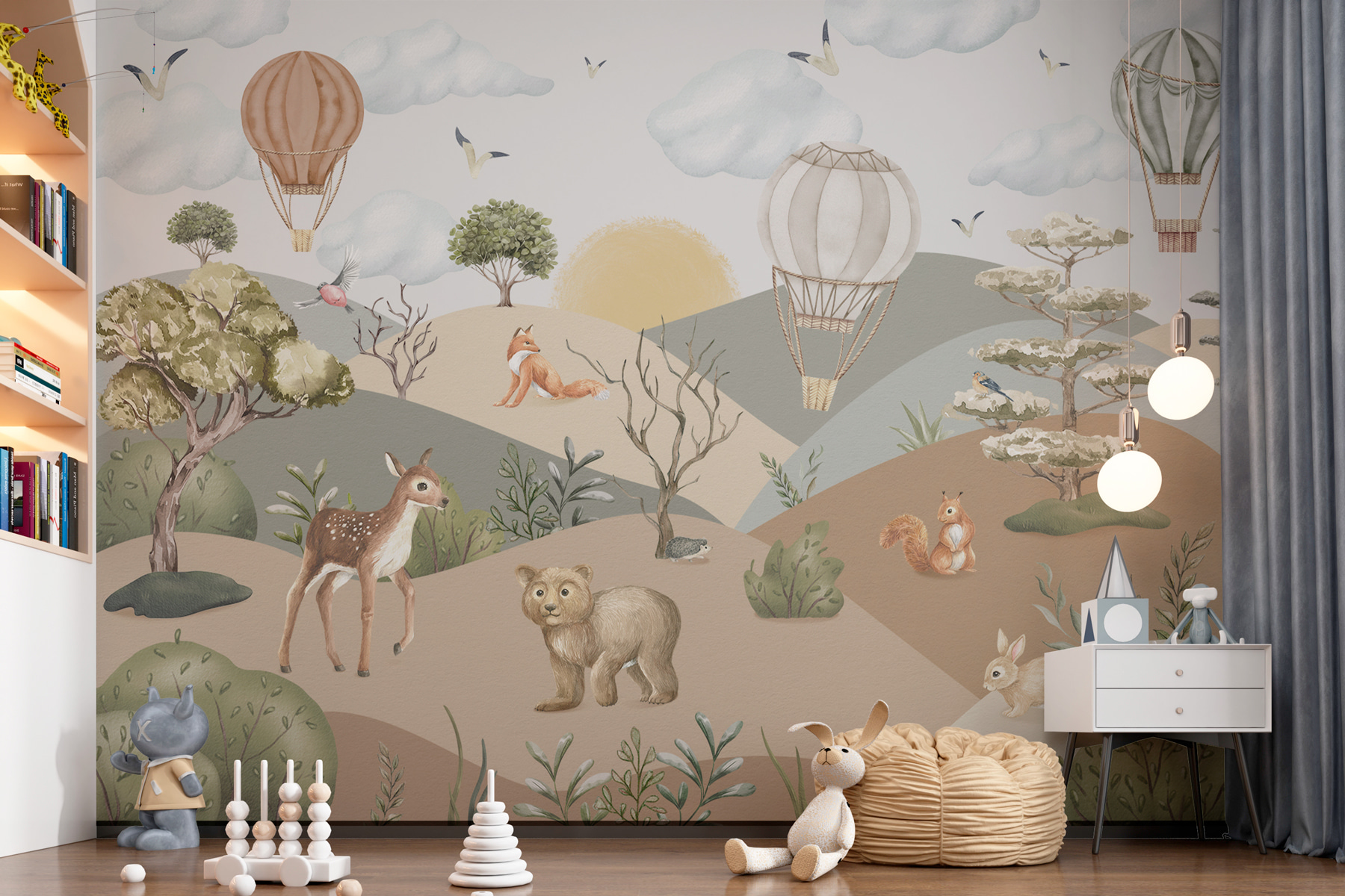 Przekształć pokój w kapryśną przygodę dzięki tej urzekającej fototapecie ściennej! To jak wkroczenie do sennego krajobrazu, w którym zwierzęta – ciekawskie jelenie i figlarne lisy – mkną pod niebem usianym uroczymi balonami na ogrzane powietrze. Idealna do pokoju dziecięcego lub kącika relaksu, jest pełna wesołych akcentów. Wyobraź sobie, że budzisz się pod spojrzeniem łagodnego niedźwiedzia lub radosnej wiewiórki. Stonowane odcienie i zabawne postacie tworzą spokojną atmosferę, jednocześnie pobudzając wyobraźnię i radość. Ponadto jest to fantastyczny początek rozmowy!