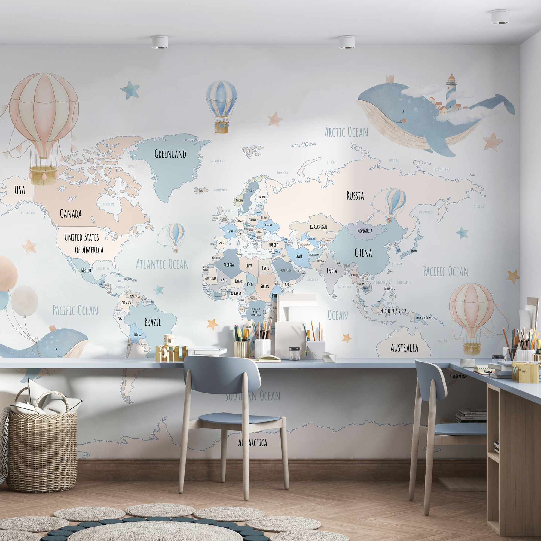 Wyobraź sobie, że dodajesz odrobinę kaprysu do pokoju swojego dziecka dzięki tej oszałamiającej fototapecie ściennej “Niebiesko-biały balon na ogrzane powietrze”. Fototapeta ta jest idealna do pobudzenia małej wyobraźni, zawierając urocze balony na gorące powietrze, szczegóły mapy i urocze zwierzęta. Wyobraź sobie blask miękkiego popołudniowego światła rzucającego delikatne cienie, dzięki czemu bajki na dobranoc stają się globalnymi przygodami. Każdy szczegół sprawia, że ściana staje się paszportem do marzeń – dzieci mogą wskazać Brazylię lub Australię i dać się ponieść ciekawości. To nie tylko mural; to codzienne zaproszenie do zastanawiania się, odkrywania i wielkich marzeń. A te delikatne pastele? Płynnie łączą się z każdym wystrojem, dodając spokojnej, ale zabawnej atmosfery. Idealne do nadania magicznego charakteru przedszkolom i pokojom zabaw.