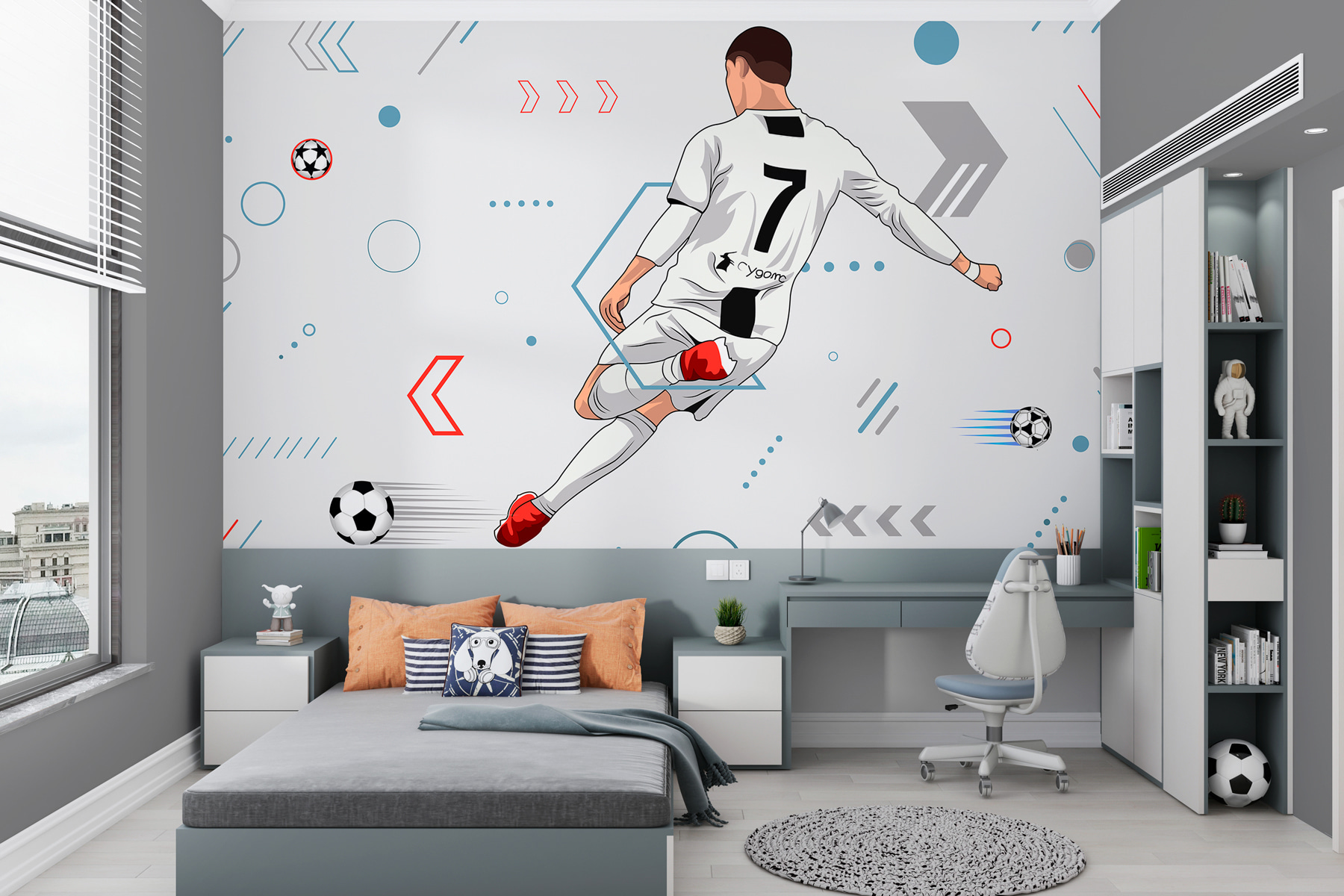 Wyobraź sobie, że wchodzisz do swojego pokoju i witasz się z tym epickim muralem przedstawiającym piłkarza kopiącego piłkę z całej siły. Można niemal poczuć energię i pasję wyskakującą ze ściany! Idealna dla każdego fana piłki nożnej, niezależnie od tego, czy masz przyszłego Messiego w przygotowaniu, czy kogoś, kto po prostu kocha piękną grę. Dzięki dynamicznym liniom i odważnym kolorom ta fototapeta robi wrażenie – to tak, jakbyś miał mini stadion w swoim domu. Idealna do pokoju dziecięcego, męskiej jaskini, a nawet biura, jeśli masz ochotę na odrobinę przygody. Za każdym razem, gdy na niego spojrzysz, wyobrazisz sobie dreszczyk emocji związany z grą, a może nawet poczujesz się trochę zainspirowany, aby rozpocząć dzień z tym samym ognistym duchem. To nie tylko dekoracja, to wybuch emocji na ścianie!