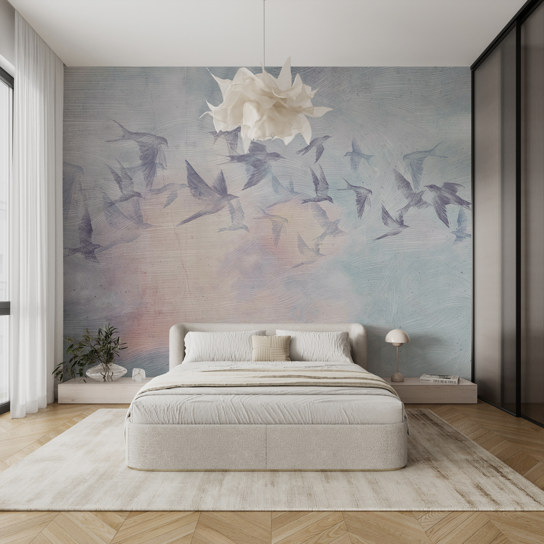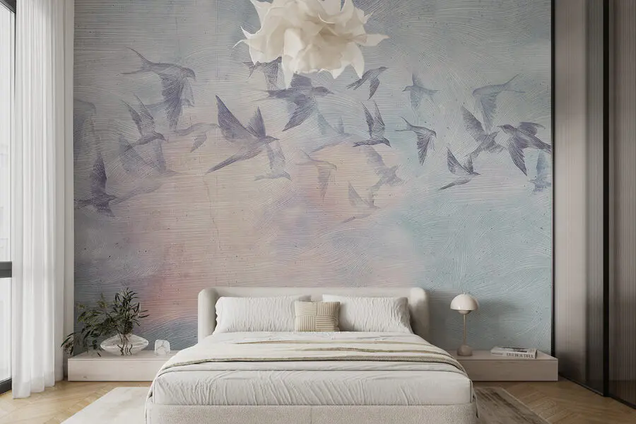 Idealna do relaksującej atmosfery, każdy ptak wydaje się szybować bez wysiłku, wprowadzając lekki i przewiewny nastrój do twojej przestrzeni. Idealna dla każdego miłośnika ptaków lub kogoś, kto po prostu kocha unikalne dekoracje, ta fototapeta sprawi, że twój pokój będzie otwarty i przestronny. Pomyśl o niej jak o przeniesieniu odrobiny świeżego powietrza do wnętrza, bez nieprzewidywalnej pogody.