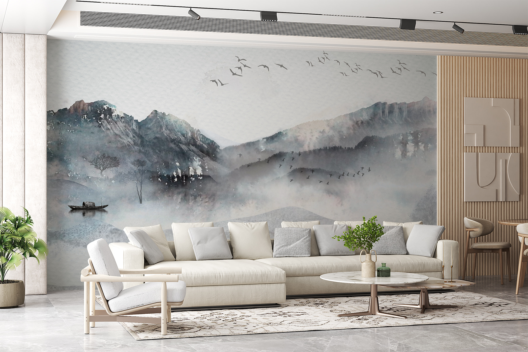Wyobraź sobie, że wchodzisz do pokoju i jesteś witany przez spokojną grupę ptaków szybujących po sennym niebie, dryfujących wysoko nad zamglonym leśnym krajobrazem. Ta akwarelowa fototapeta to nie tylko sztuka – to doświadczenie. Uspokajająca mgła, miękkie wzgórza i odległe góry – delikatny szept natury. To prawie tak, jakbyś słyszał szept drzew i czuł chłodne, rześkie poranne powietrze muskające twoją skórę.