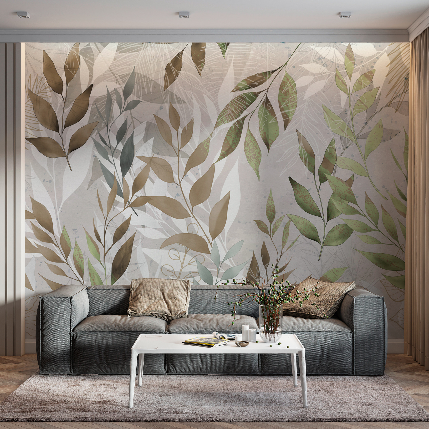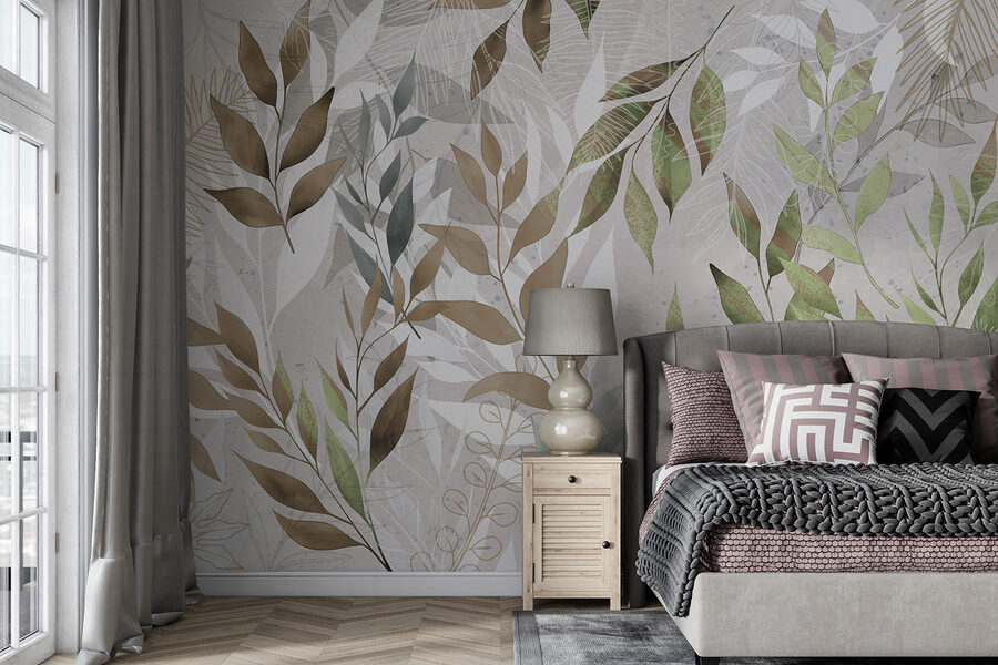 Kolory to delikatne, ale żywe zielenie i brązy, idealnie zmieszane, aby nadać temu bez wysiłku fajny wygląd. Za każdym razem, gdy na nią spojrzysz, możesz poczuć się trochę bardziej zrelaksowany, jakbyś brał mini-wakacje. Świetne rozwiązanie dla osób, które kochają piękno natury, ale nie zawsze mogą przebywać na zewnątrz. Ta fototapeta nie tylko dekoruje, ale tworzy doświadczenie – wyobraź sobie przytulne poranki z kawą lub wieczory z delikatną muzyką, otoczone tą piękną liściastą grafiką. Idealna do marzeń.