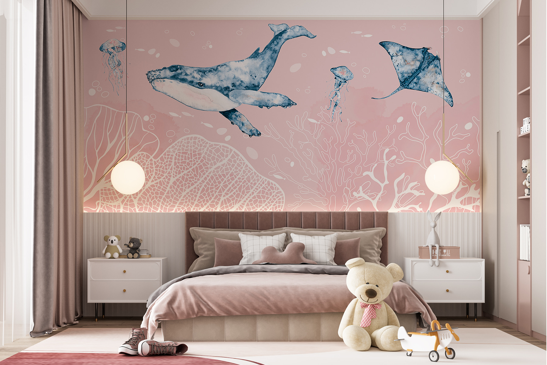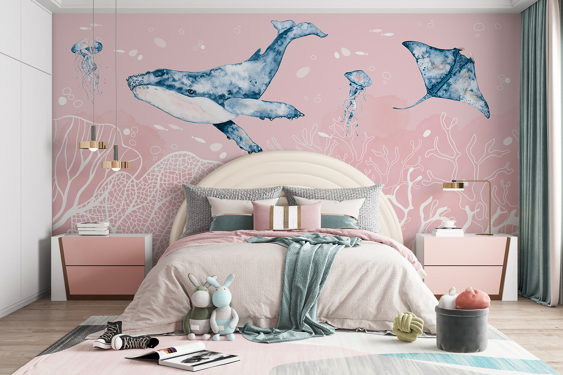 Idealny do pokoju dziecięcego, kreatywnego miejsca pracy lub wszędzie tam, gdzie potrzebujesz odrobiny spokoju. Zobacz, jak oczy twoich gości rozświetlają się mieszanką podziwu i ciekawości, jakby odkryli sekretny podwodny ogród. To nie tylko mural – to doświadczenie, początek rozmowy, kojące tło dla codziennego życia. Zanurz się i pozwól, by fale kreatywności i spokoju ogarnęły Twoją przestrzeń. 🌊🐋