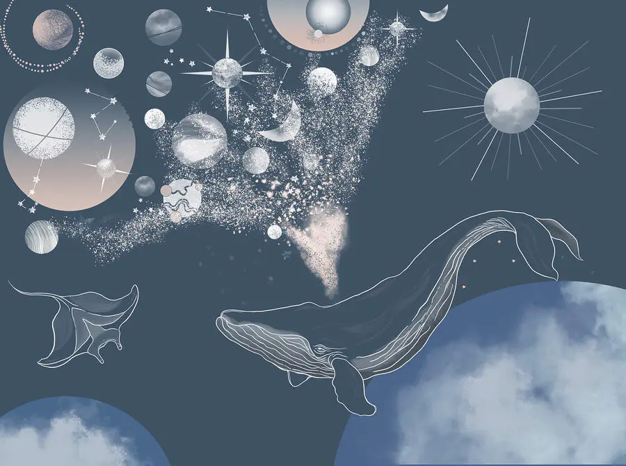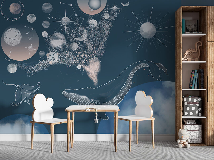 Fototapeta ścienna “Księżyc i księżyc” to jeden z tych elementów, które przenoszą cię prosto do marzeń. Wyobraź sobie, że twój pokój staje się podwodnym miejscem do obserwacji gwiazd. Tak, to prawda. Ta fototapeta przedstawia majestatycznego wieloryba płynącego przez kosmiczną scenę z planetami, gwiazdami i fazami księżyca unoszącymi się wokół – to tak, jakby ocean spotkał się z wszechświatem! Idealny do dodania odrobiny magii do każdej przestrzeni. Goście mogą po prostu zatracić się w śledzeniu konstelacji i wyobrażaniu sobie historii kryjącej się za każdym obiektem niebieskim. To początek rozmowy, showstopper i przytulne schronienie w jednym. Zanurz się i pozwól swoim ścianom opowiedzieć kapryśną historię!