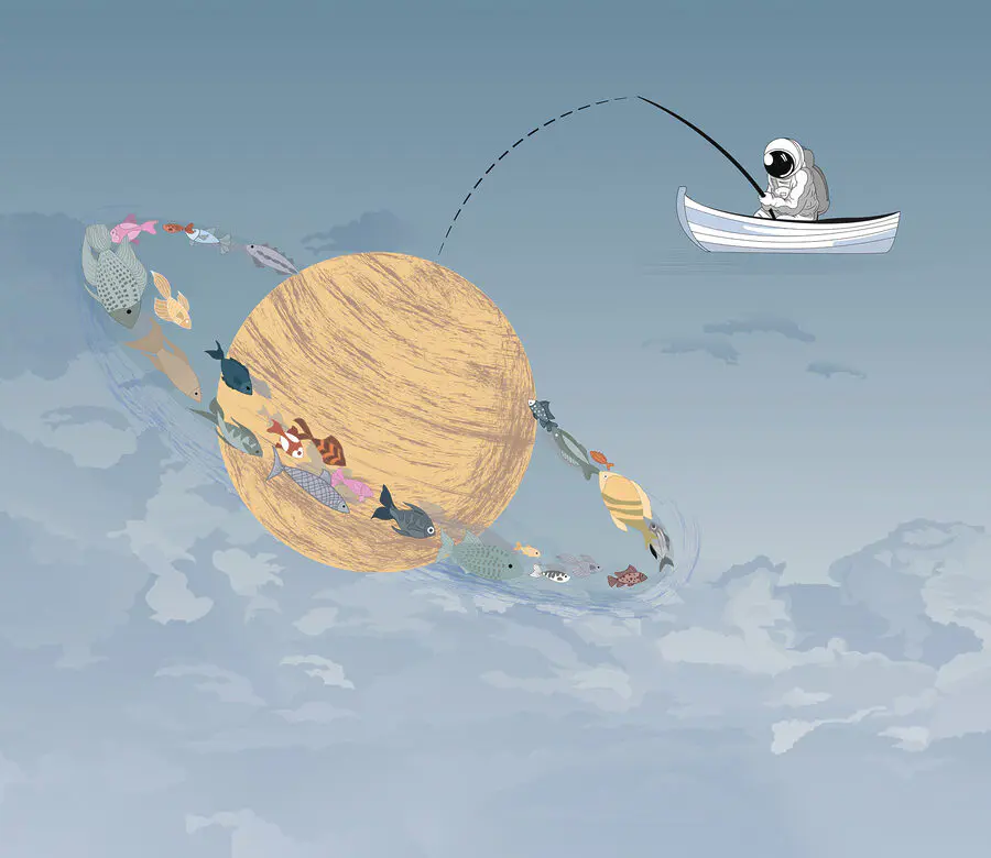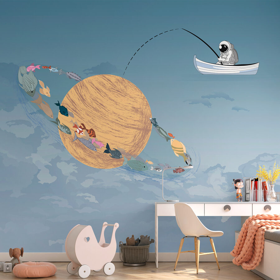 Wyobraź sobie przytulną małą wyprawę na ryby, ale zamiast spokojnego jeziora unosisz się w chmurach. Ta fototapeta ożywia to marzenie. Wyobraź sobie kapryśną scenę mężczyzny w łodzi, łowiącego ryby na niebie, z kolorowymi rybami pływającymi wokół gigantycznej, wirującej planety. Jasne błękity i delikatne biele tworzą pogodny nastrój, idealny do marzeń. To jak sekretna przygoda czekająca tuż nad twoją głową. Idealny do pokoju dziecięcego lub kreatywnej przestrzeni, pobudza wyobraźnię i dodaje zabawnego akcentu każdej ścianie. Kto nie chciałby rzucić linki w chmury?