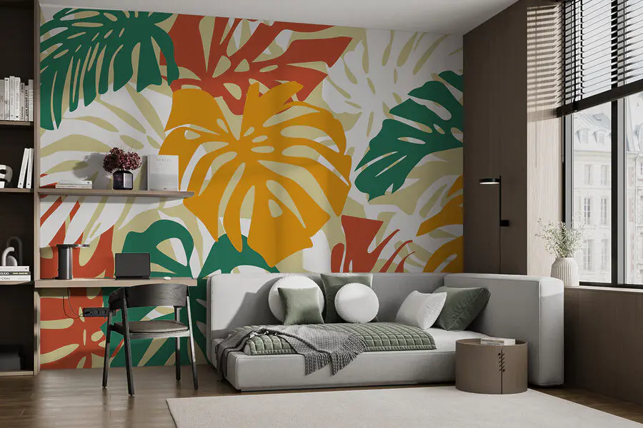 Wyobraź sobie, że wkraczasz do przestrzeni, w której czujesz się jak w tropikach, we własnym domu. Ta fototapeta, pełna kolorowych liści na białym tle, ma ten żywy styl, który może sprawić, że każdy poczuje się nieco bardziej żywy. To jak przeniesienie kawałka natury do wnętrza – ale bez robaków.