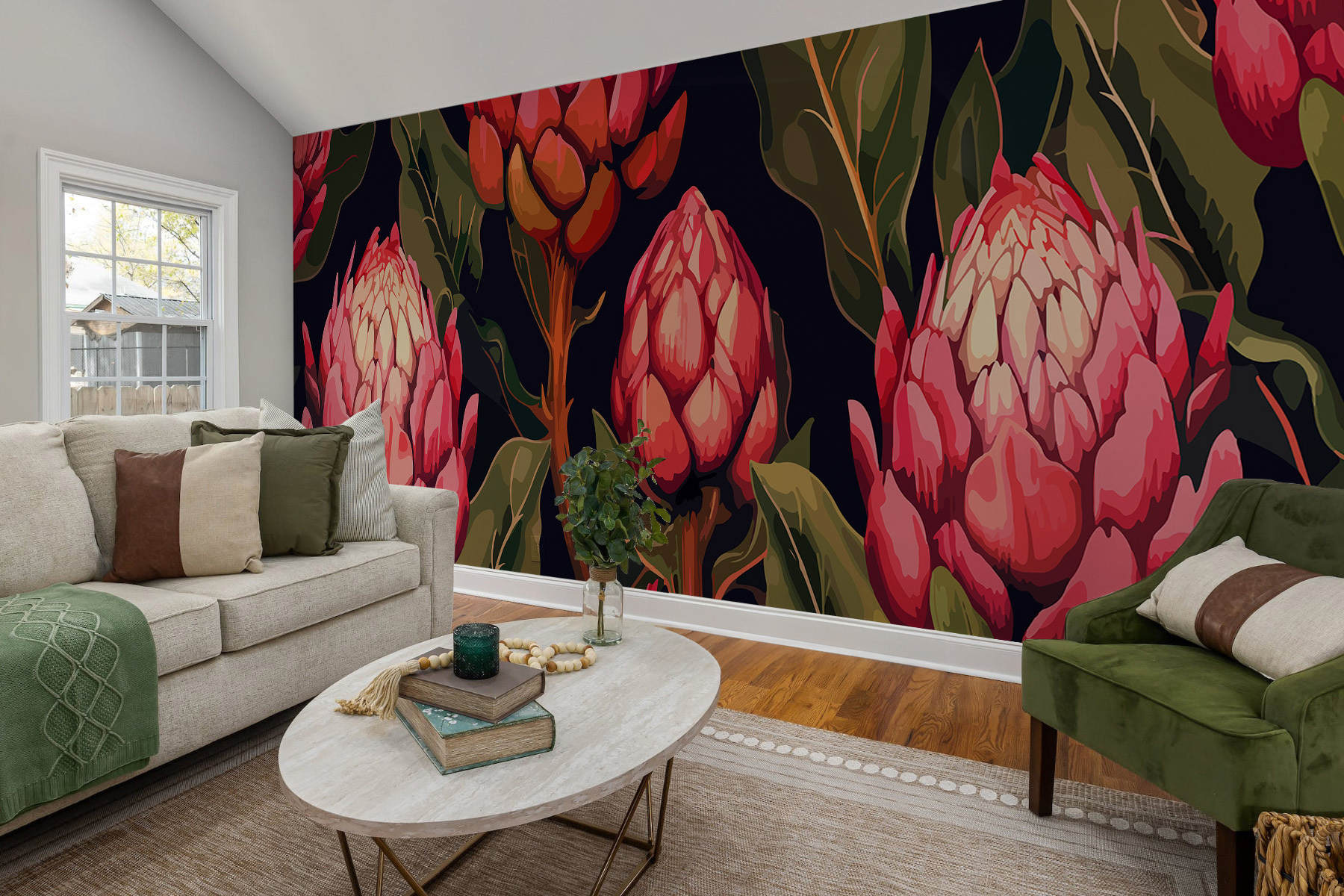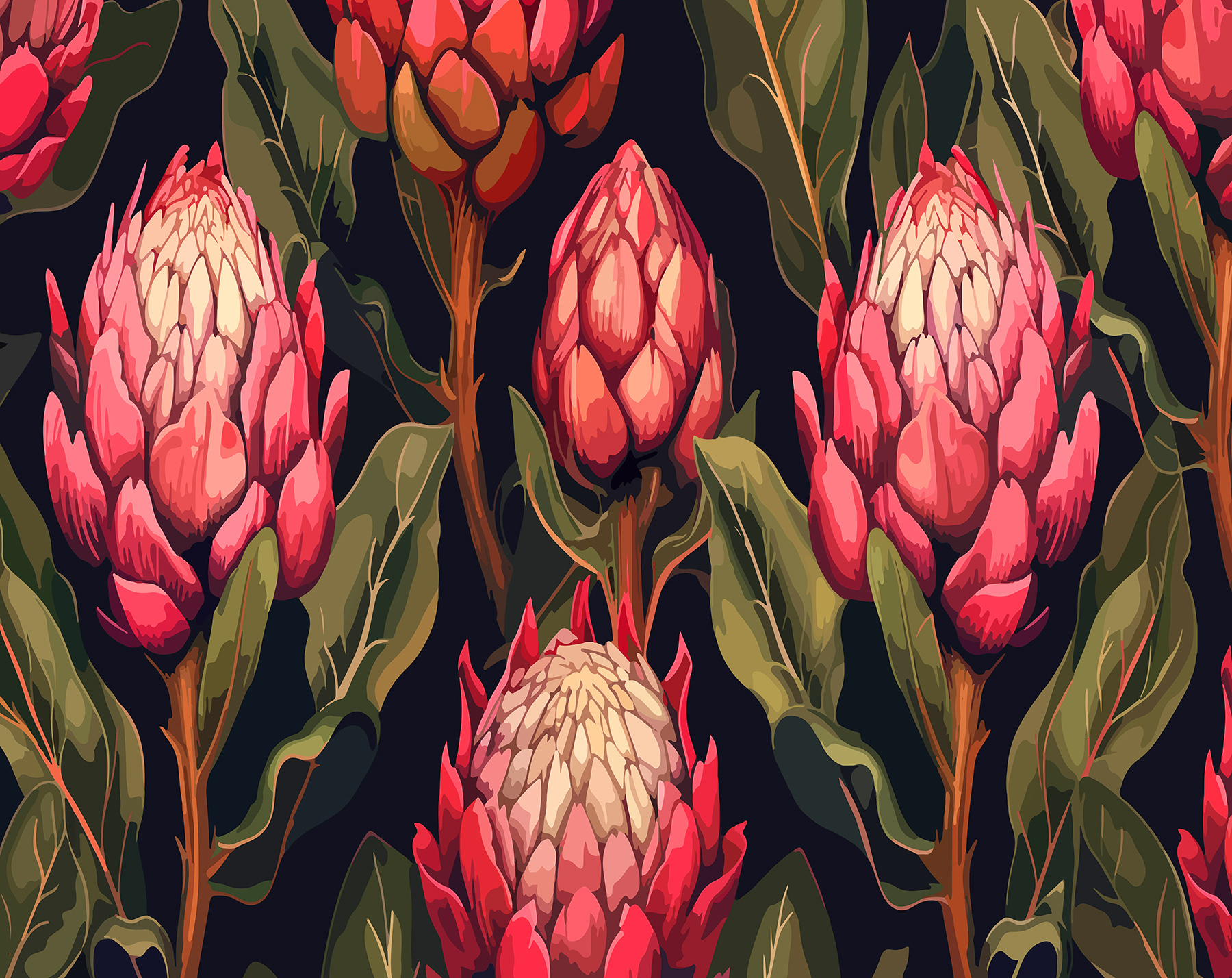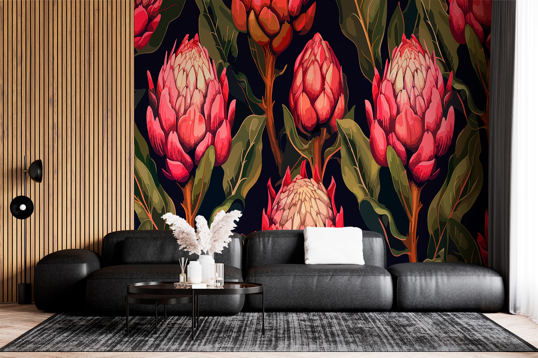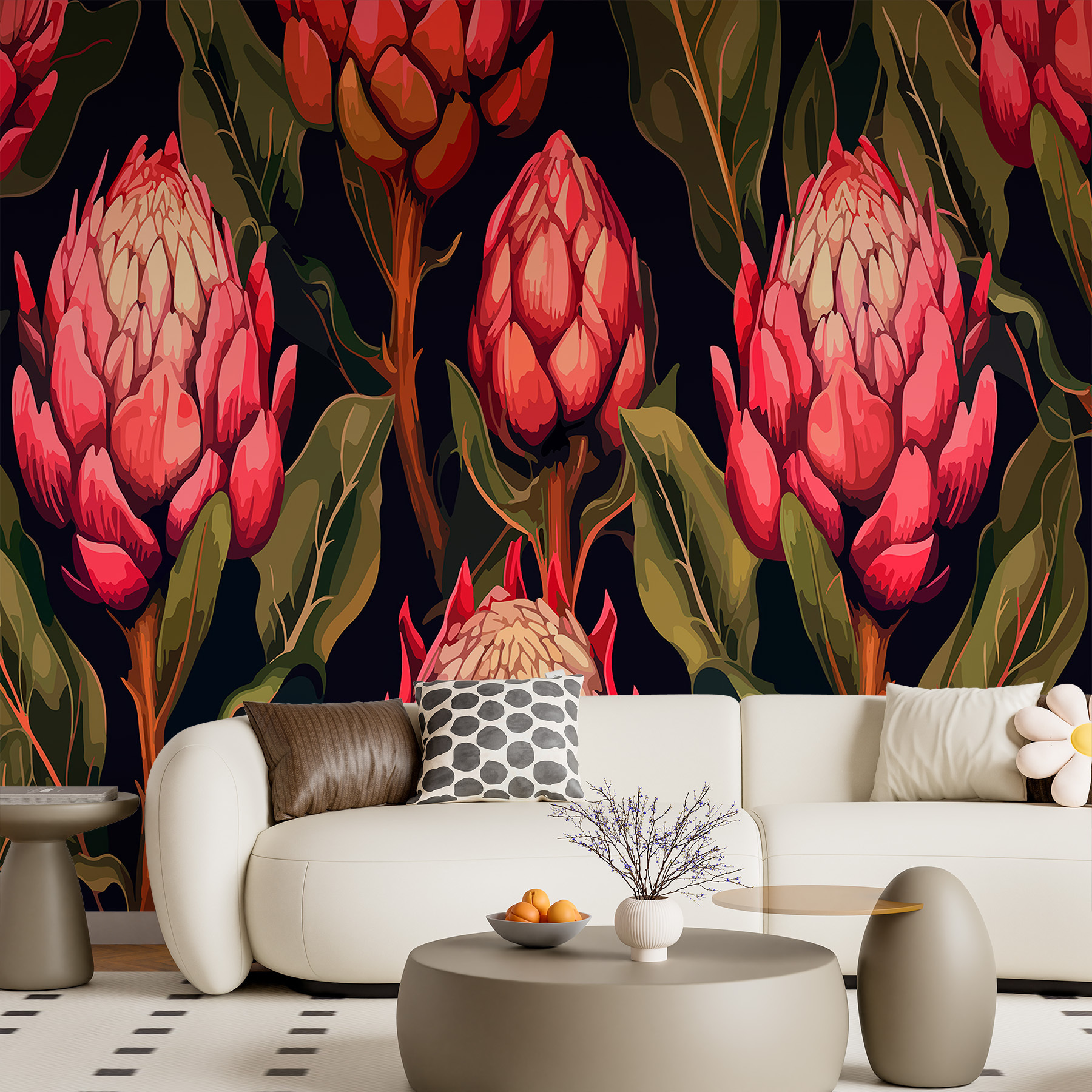Przekształć dowolną ścianę w tętniącą życiem oazę dzięki fototapecie Blooming Proteas. Wyobraź to sobie: eksplozja żywych kolorów i uderzających wzorów kwiatowych, które praktycznie tańczą w Twojej przestrzeni. To jak przeniesienie małego kawałka natury do wnętrza, bez konewki i uciążliwych alergii na pyłki. Ta fototapeta nie tylko tam siedzi – ona pobudza rozmowy i poprawia nastrój. Wyobraź sobie przytulne wieczory, przyjaciół podziwiających piękno lub ciche poranki spędzone na popijaniu kawy, czując się jak w otoczeniu bujnego ogrodu. Niezależnie od tego, czy jest to salon, czy przytulny kącik, ta fototapeta zaprasza ciepło i radość. Idealna do każdego miejsca, w którym przyda się odrobina osobowości!