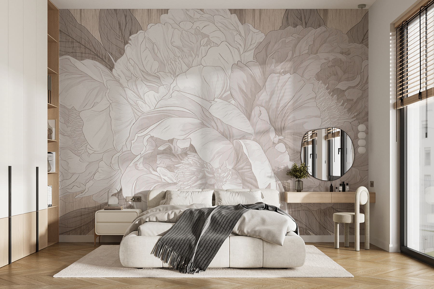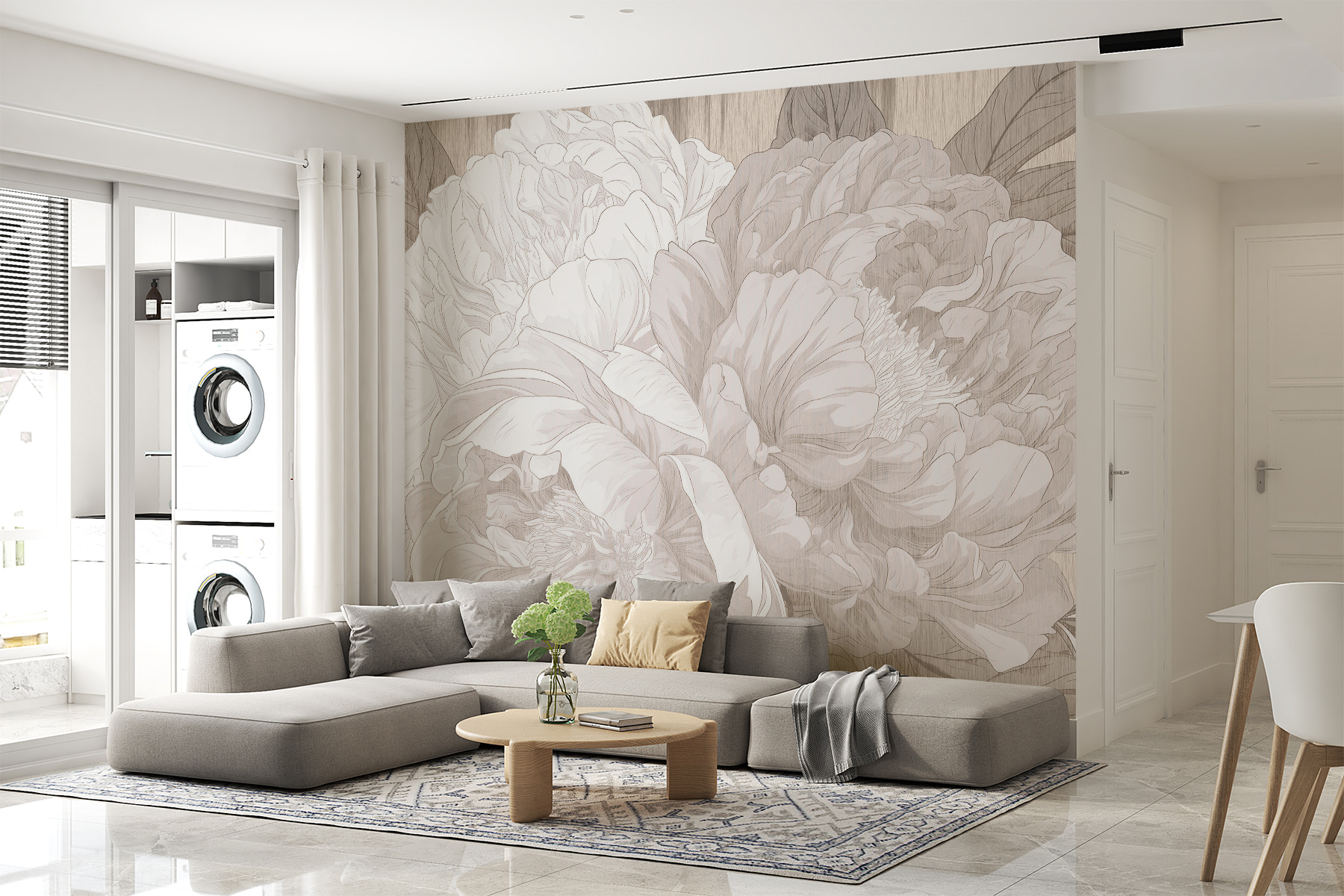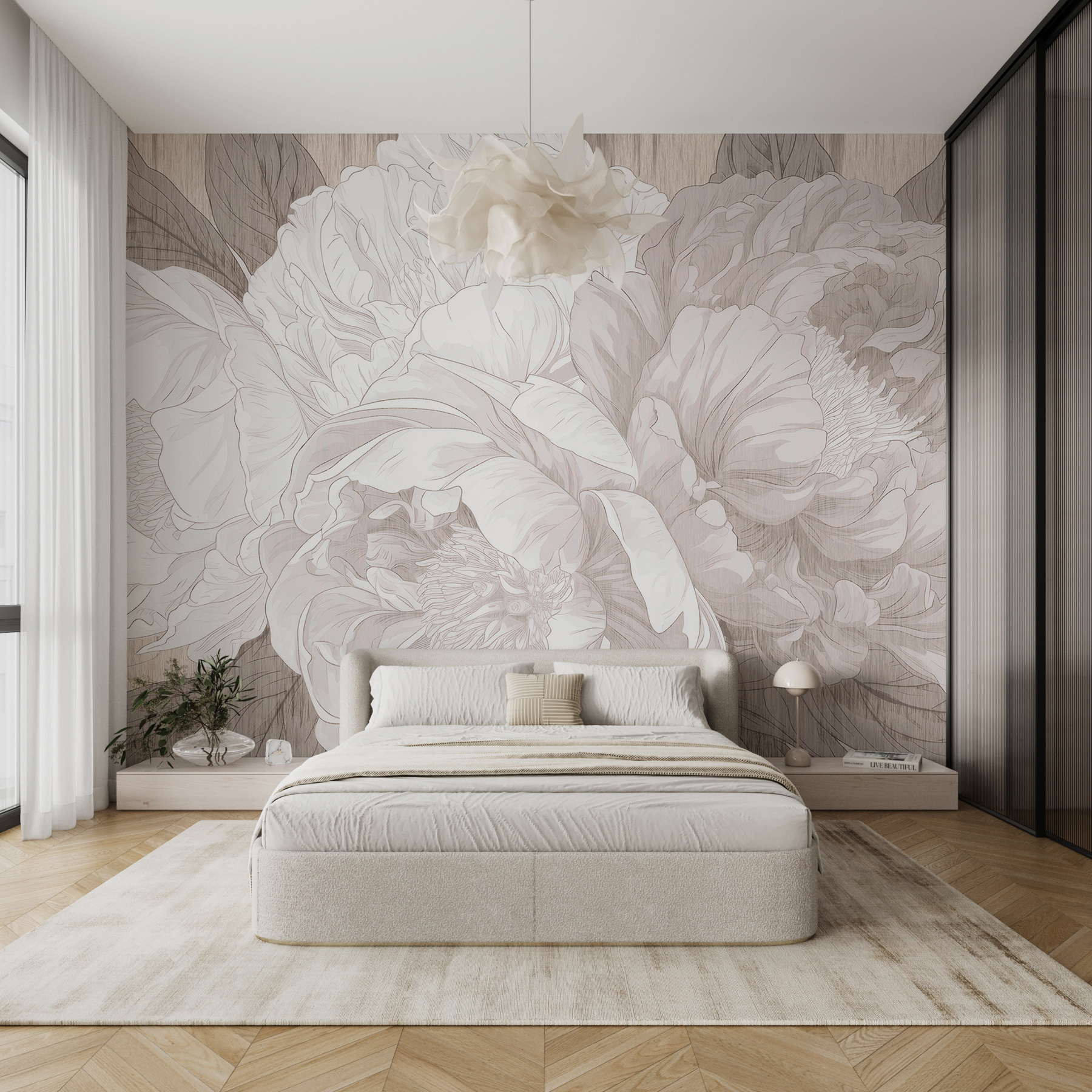 Wyobraź to sobie – siedzisz w swoim salonie z filiżanką herbaty w ręku, a ścianę zdobi efektowna fototapeta z piwoniami. To tak, jakby kwiaty same szeptały elegancję do pokoju. Monochromatyczny szkic nadaje mu wyrafinowany klimat, prawie tak, jakbyś był w eleganckiej galerii sztuki, a może nawet w wietrznym, zaczarowanym ogrodzie. Idealny dla każdego, kto kocha odrobinę uroku natury bez krzyczenia. Dodatkowo, wprowadza spokojny, pokojowy nastrój – dodając odrobinę spokoju do tych zabieganych dni. Idealne, prawda?