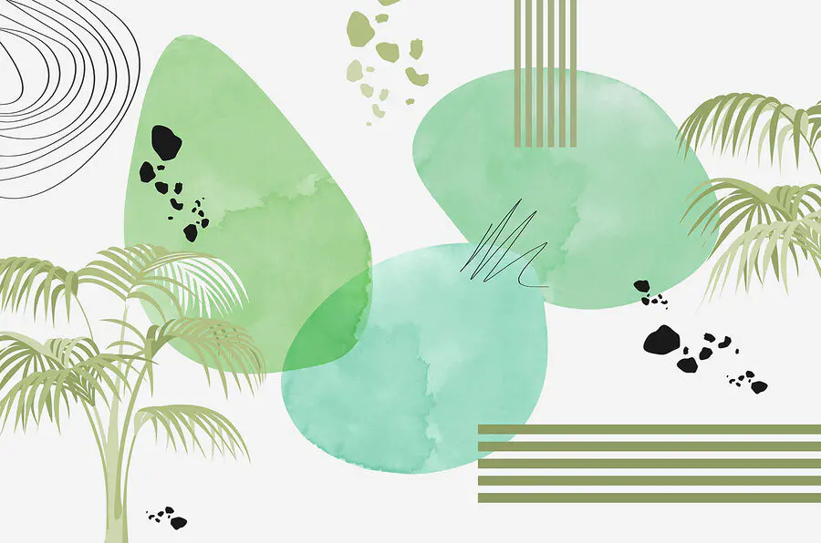 Wyobraź to sobie: odrobina świeżej, nowoczesnej sztuki na Twojej ścianie! Ta fototapeta ma białe tło z zabawnymi zielonymi odcieniami, okręgami i liniami – to tak, jakby natura i geometria miały kapryśną imprezę taneczną. Idealna dla tych współczesnych klimatów, ale z delikatnym ukłonem w stronę akwareli i magii liści 3D.