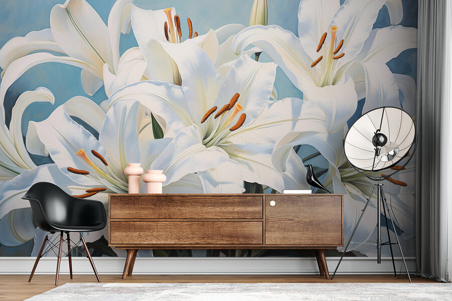Odmień swoją przestrzeń dzięki tej oszałamiającej fototapecie ściennej z eleganckimi białymi liliami w pełnym rozkwicie. To tak, jakby mieć ogród bezpośrednio na ścianie, wnosząc odrobinę natury do wnętrza. Wyobraź sobie, że każdego ranka budzisz się z tymi pięknymi kwiatami, jakby szeptały: “Dzień dobry!”. Idealnie nadaje się do rozjaśnienia przytulnego kącika lub nadania wyrazu w większym pomieszczeniu. Delikatne kolory tworzą uspokajającą atmosferę, zapraszając do chwil wyciszenia. Znajomi będą zatrzymywać się i podziwiać, być może pytając, gdzie znalazłeś tak wyjątkowy przedmiot. To łatwy sposób na dodanie piękna bez konieczności posiadania zielonego kciuka!
