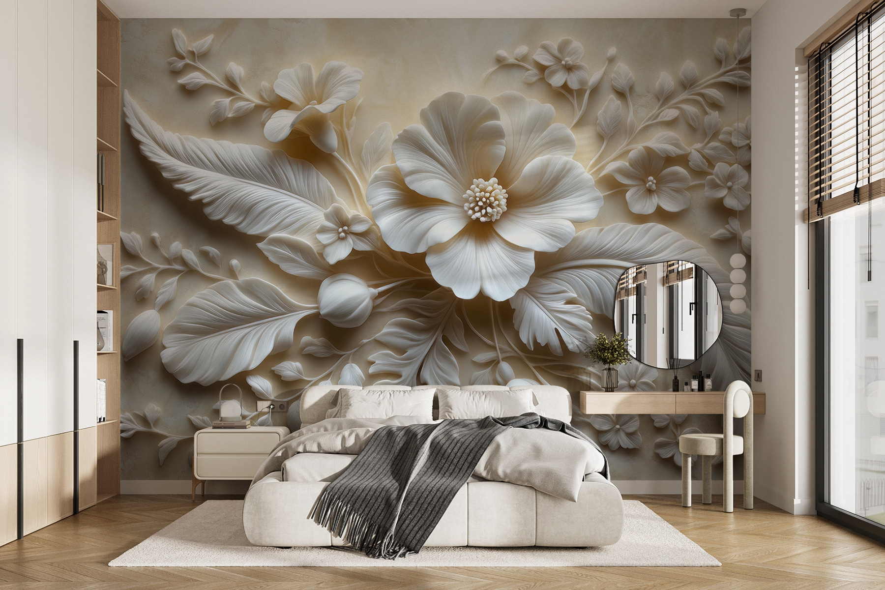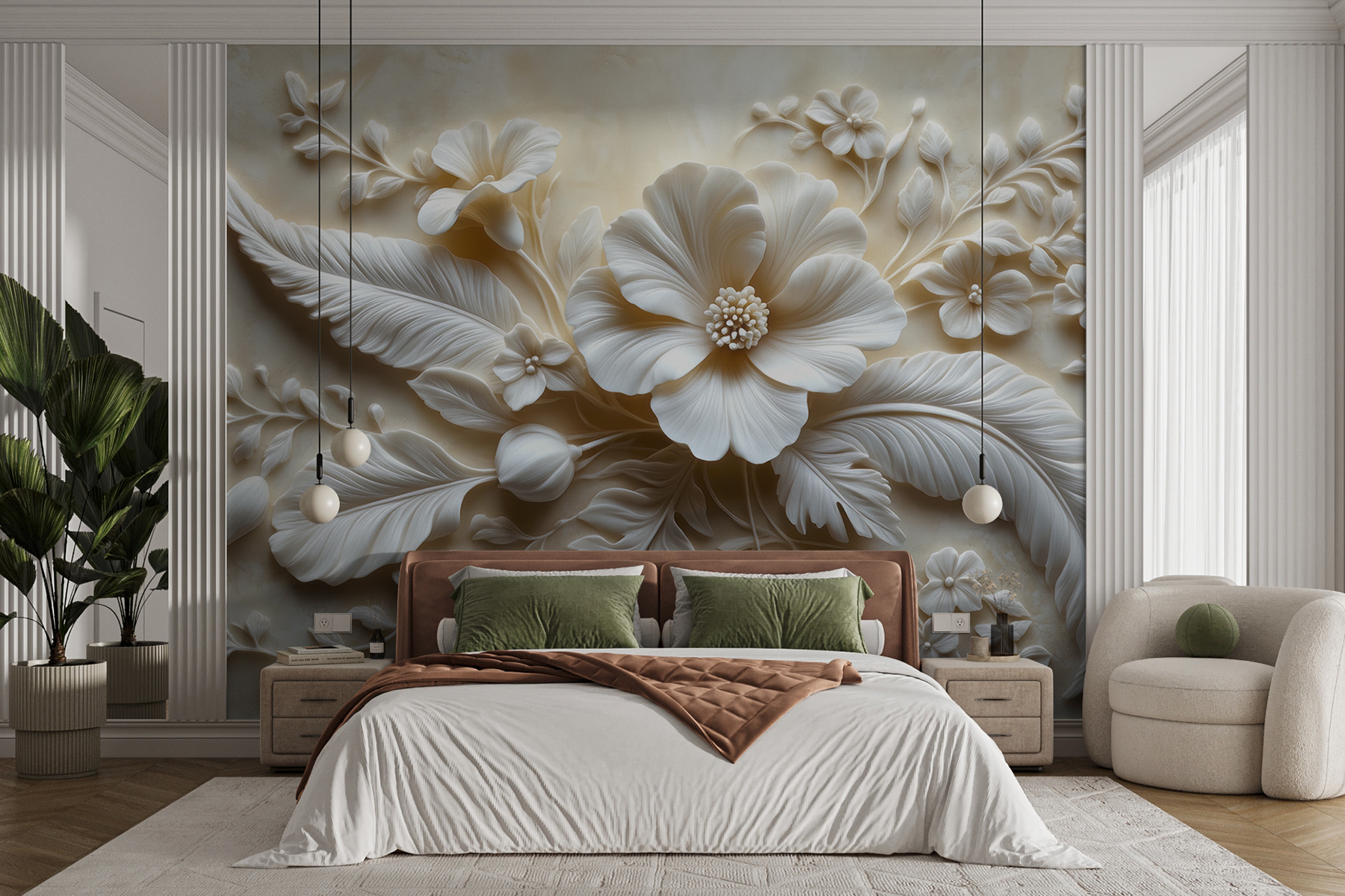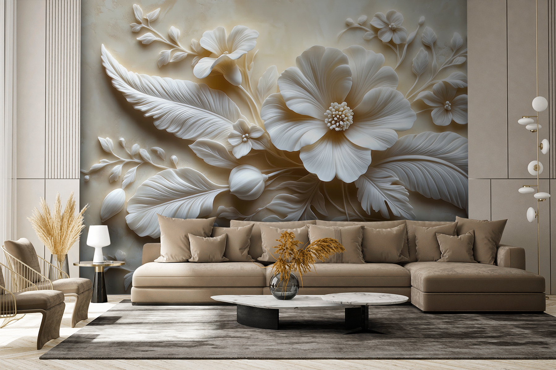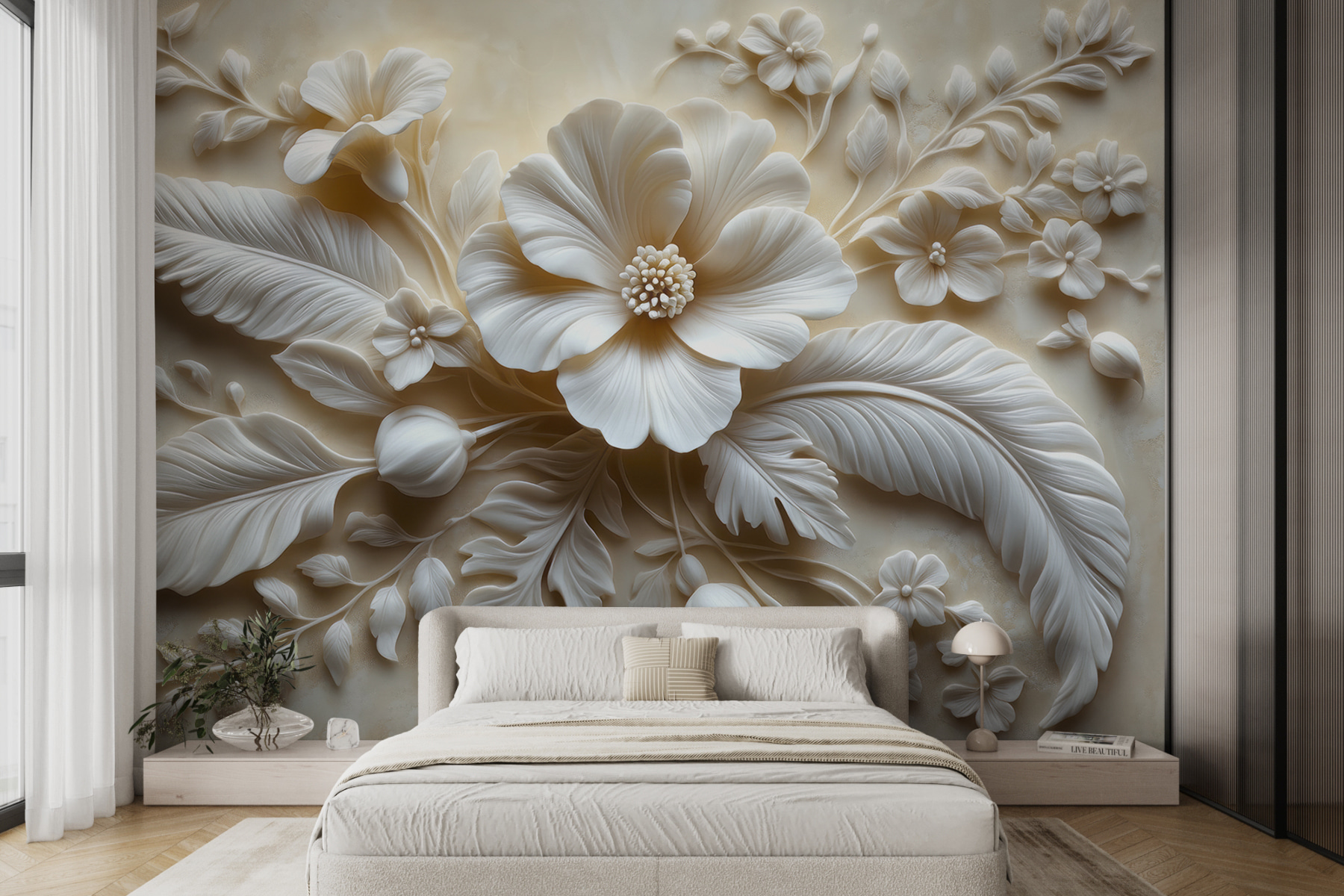 Przekształć dowolny pokój w spokojną ucieczkę dzięki tej oszałamiającej fototapecie ściennej z delikatnymi białymi kwiatami i bujnymi liśćmi. Wyobraź sobie, że wchodzisz do swojej przestrzeni i czujesz się natychmiast podniesiony na duchu przez otaczającą cię delikatną elegancję. To jak przeniesienie ogrodu do domu – bez konewki! Misterny wzór przyciąga wzrok i zachęca do rozmowy, dzięki czemu idealnie nadaje się do przytulnego zakątka lub tętniącego życiem salonu. Znajomi prawdopodobnie zatrzymają się, zastanawiając się, gdzie znalazłeś taki klejnot. Poczuj uspokajającą obecność natury w swoim domu. Kto by pomyślał, że ściany mogą być tak ciepłe?
