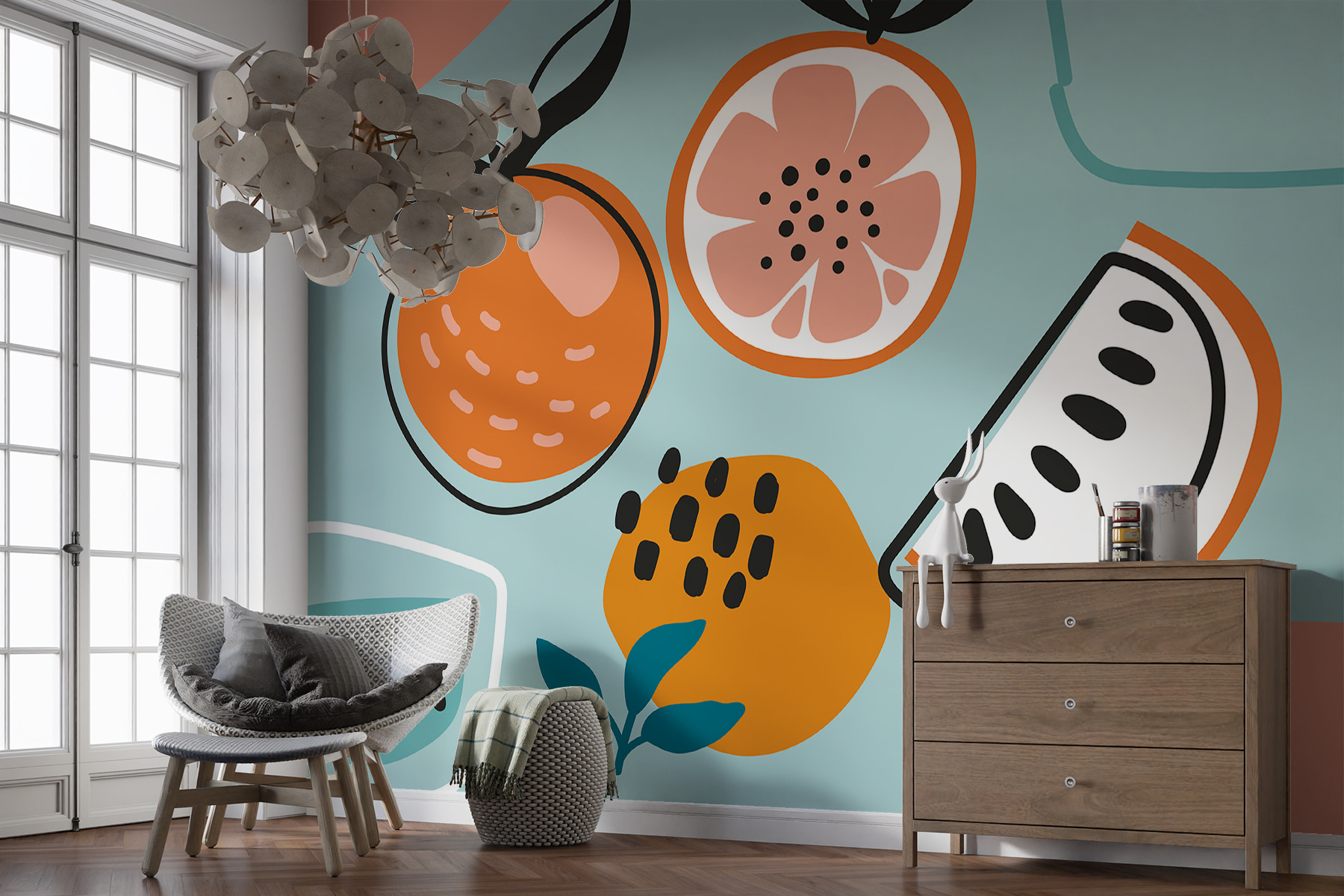 Czy kiedykolwiek chciałeś, aby Twoje ściany wyrażały coś bez słów? Poznaj fototapetę ścienną W01421! Ta zachwycająca fototapeta wnosi zabawny pop do każdej przestrzeni – jak przyjazny plusk koloru prosto ze szkicownika artysty. Z kawałkami soczystych pomarańczy, dziwacznymi kształtami i wybuchem natury, jest jak spontaniczna sesja artystyczna, która idealnie wylądowała na twojej ścianie.