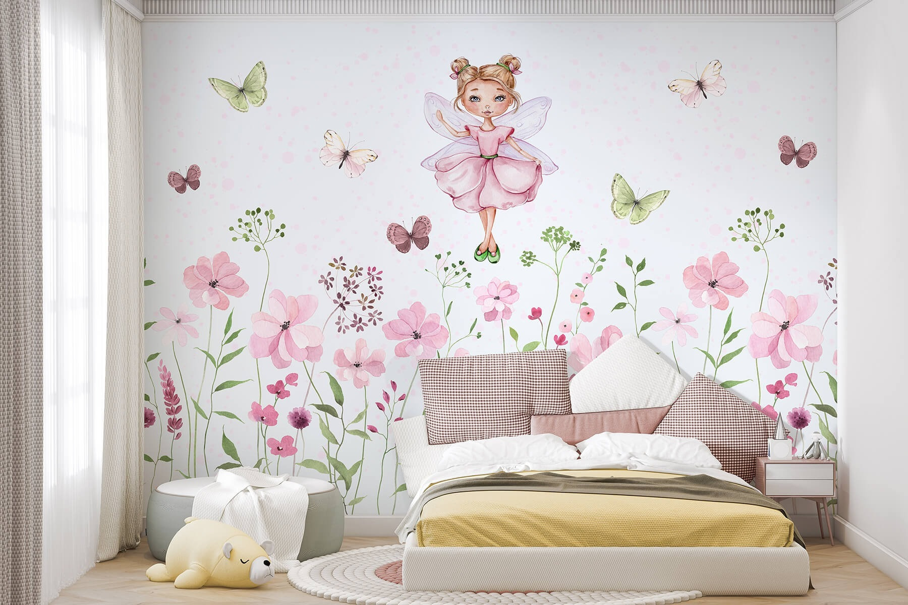 Przekształć dowolną przestrzeń w kapryśne miejsce dzięki tej czarującej fototapecie ściennej “Akwarela wróżki w różowej sukience otoczonej kwiatami”. Wyobraź sobie rozkoszną wróżkę, przyłapaną w połowie tańca, otoczoną polem delikatnych pasteli. To jak wejście do bajki, w której motyle delikatnie trzepoczą. Wyobraź sobie, że każdego dnia budzisz się w tej radosnej scenerii – czy to nie podnosi na duchu? Idealny do pokoju dziecięcego lub przytulnego zakątka, dodaje odrobinę magii, a bądźmy szczerzy, komu nie przydałoby się trochę więcej magii w życiu? Idealna do marzeń na jawie lub inspirowania kreatywności, urokowi tej fototapety po prostu nie można się oprzeć. Chwyć więc filiżankę herbaty, usiądź wygodnie i pozwól, aby bajki rozwijały się wokół ciebie!