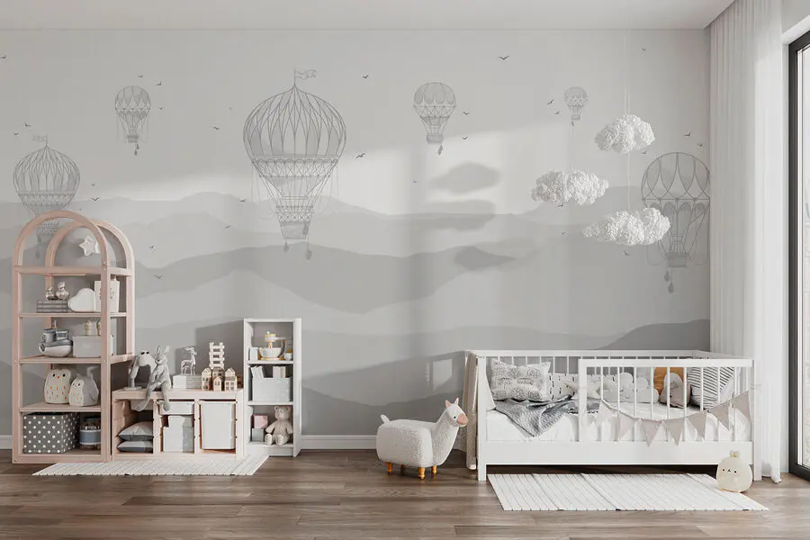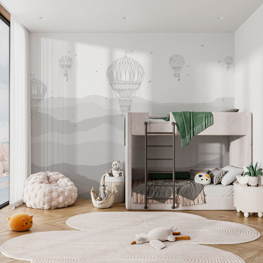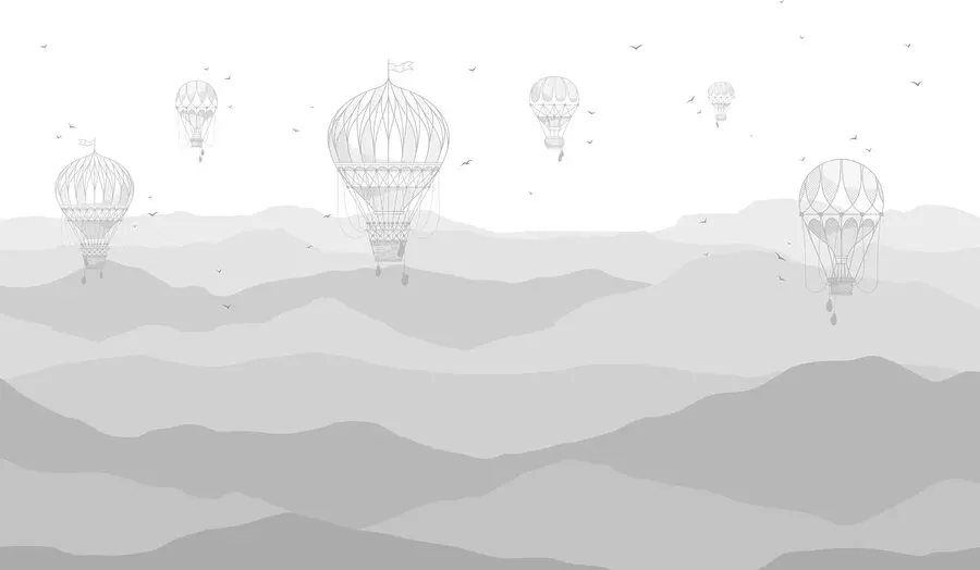 Delikatne góry w skali szarości i zwiewne balony niemal przywodzą na myśl delikatną bryzę – czyż nie można tego po prostu poczuć? Być może popijasz poranną kawę lub relaksujesz się po długim dniu, spoglądając na tę fototapetę… i nagle znajdujesz się na wysokości 10 000 stóp, dryfując wśród chmur. To nie tylko dekoracja ścienna; to cała atmosfera – delikatna, marzycielska i zawsze tak lekko magiczna… dokładnie to, czego nigdy nie wiedziałeś, że twoja przestrzeń potrzebuje!