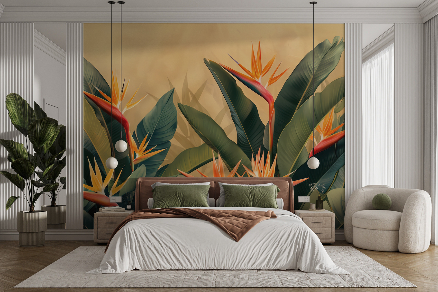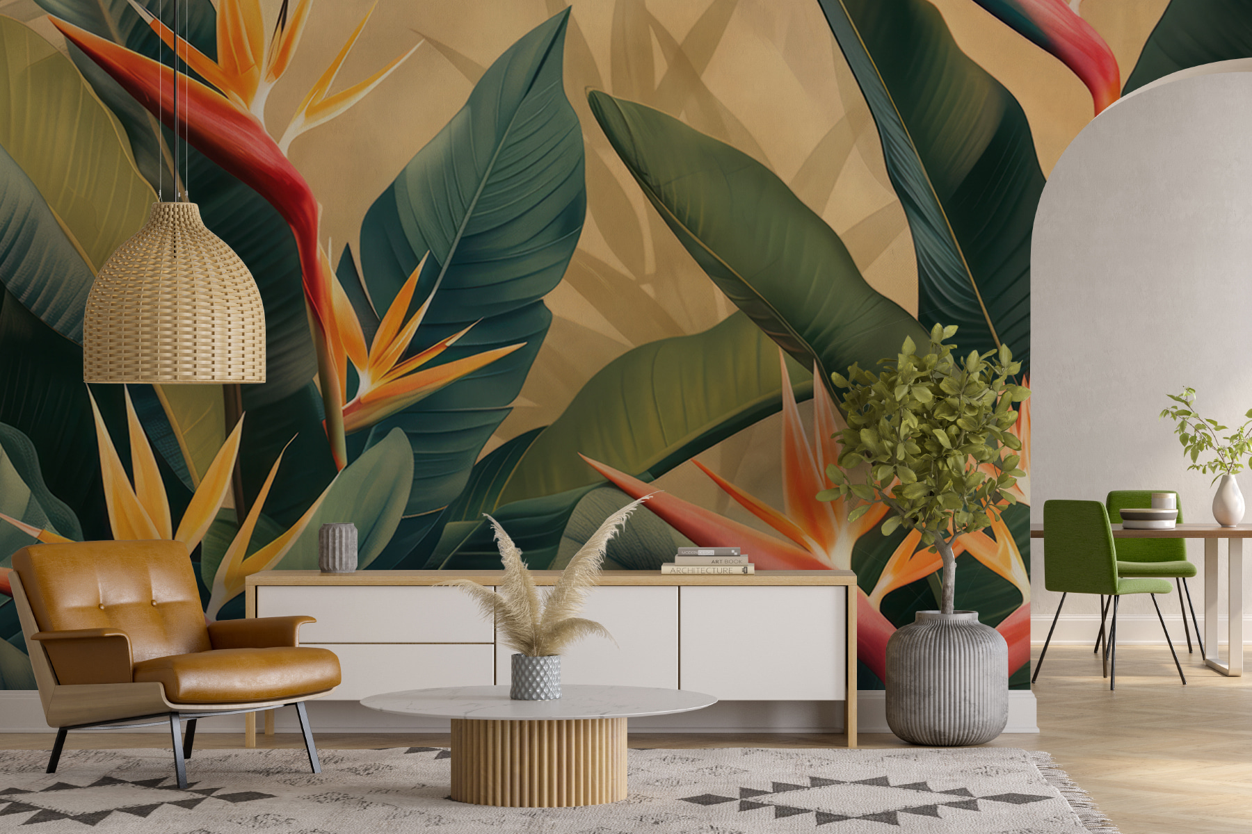 Przekształć dowolny pokój w tropikalny raj dzięki tej oszałamiającej fototapecie ściennej z żywymi roślinami Bird of Paradise. Bogata zieleń i ogniste pomarańcze tworzą żywe tło, natychmiast poprawiając nastrój. Wyobraź sobie, że wchodzisz do swojego salonu i czujesz się jak na skąpanej w słońcu tropikalnej wycieczce. To jak przeniesienie kawałka natury do wnętrza – idealne na przytulne popołudnia z książką lub może bezczelnym koktajlem w ręku. Ponadto jest to świetny początek rozmowy. Goście będą pytać, skąd wziął się ten bajeczny mural, a ty możesz się uśmiechnąć i powiedzieć, że to sekret twojej eleganckiej ucieczki!